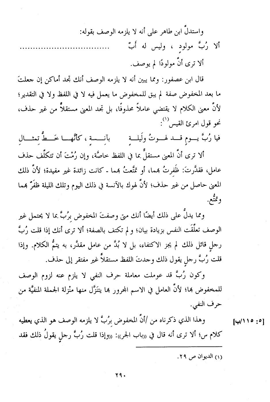 وكون رب قد عوملت معاملة حرف الفنفي لا يلزم عنه لزوم الوصف للمخفوض بها؛ لأن العامل في الاسم المجرور بها يتنزل منها منزلة الجملة المنفية من حرف النفي.