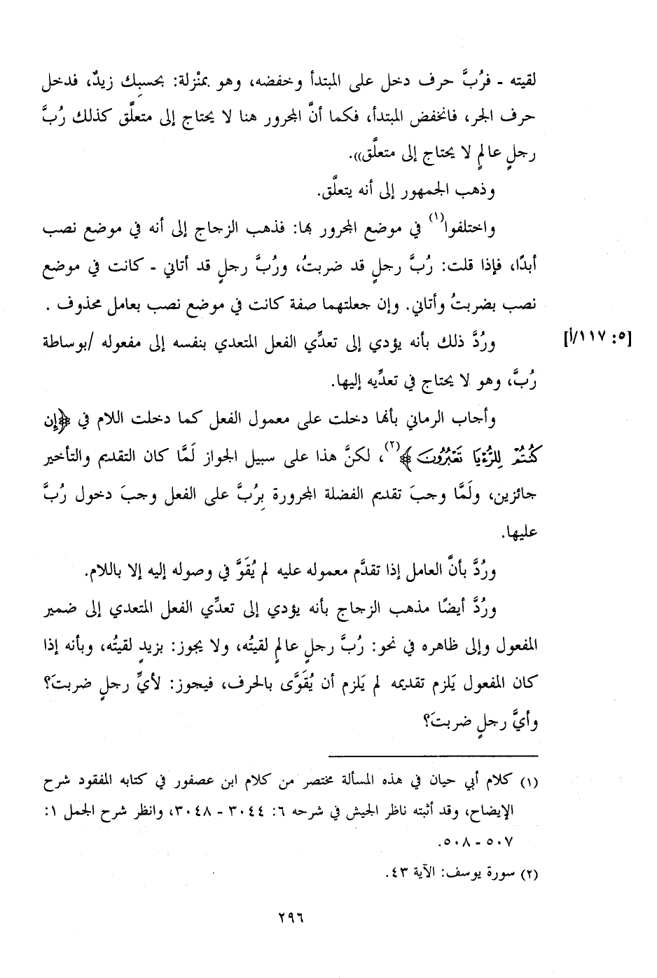 واختلفوا في موضع المجرور بها: فذهب الزجاج إلى أنه في موضع نصب أبدا، فإذا قلت: رب رجل قد ضربت، ورب رجل قد أتاني- كانت في موضع نصب بضربت وأتاني. وإن جعلتهما صفة كانت في موضع نصب بعامل محذوف.
