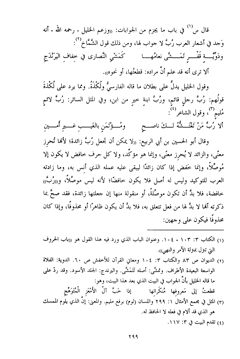 وقول الخليل يدل على بطلان ما قاله الفارسي ولكذة. ومما يرد على لكذة قولهم: رب رجل قائم، ورب ابنة خير من ابن، وفي المثل السائر: رب لائم مليم، وقول الشاعر: