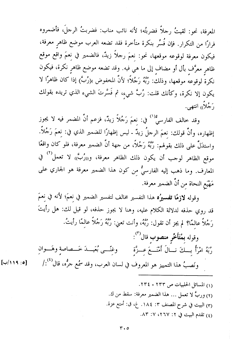 واستدل علي ذلك بقولهم: ربه رجلا، من جهة أن الضمير معرفة، فلو كان واقعاً موقع الظاهر لوجب أن يكون ذلك الظاهر معرفة، و "رب" لا تعمل في المعارف. وما ذهب إليه الفارسي من كون هذا الضمير معرفة هو الجاري علي مهيع النجاة من أن الضمير معرفة.