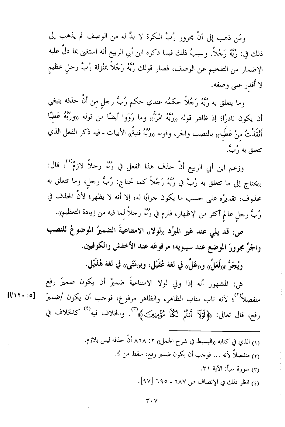 ش: المشهور أنه إذا ولي لولا الامتناعية ضمير أن يكون ضمير رفع منفصلاً؛ لأنه ناب مناب الظاهر، والظاهر مرفوع، فوجب أن يكون/ ضمير رفع، قال تعالى: {لَوْلا أَنْتُمْ لَكُنَّا مُؤْمِنِينَ}. والخلاف فيه كالخلاف