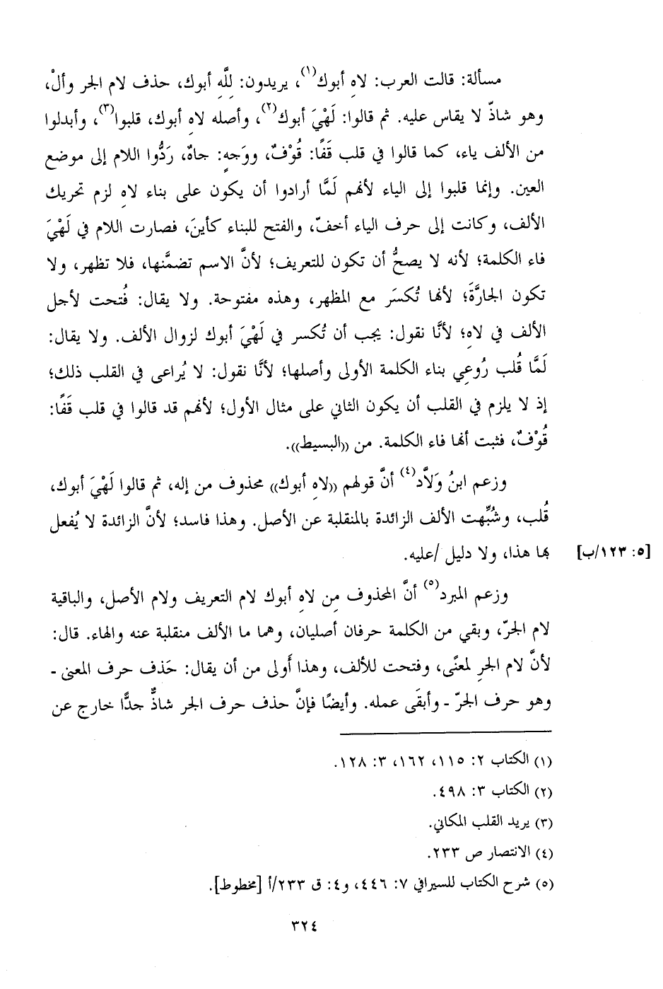 وزعم المبرد أن المحذوف من لاه أبوك لام التعريف ولام الأصل، والباقية لام الجر، وبقي من الكلمة حرفان أصليان، وهما ما الألف منقلبة عنه والهاء. قال: لأن لام الجر لمعنى، وفتحت للألف، وهذا أولى من أن يقال: حذف حرف المعني- وهو حرف الجر- وأبقى عمله. وأيضاً فإن حذف حرف الجر شاذ جداً خارج عن