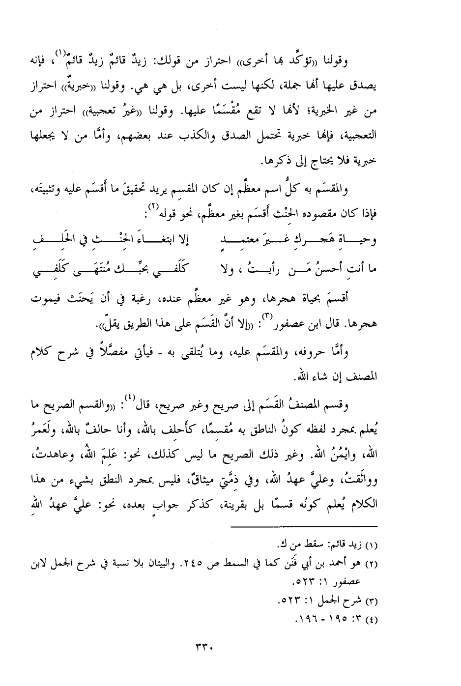 وقسم المصنف القسم إلي صريح وغير صريح، قال: "والقسم الصريح ما يعلم بمجرد لفظه كون الناطق به مقسماً، كأحلف بالله، وانا حالف بالله، ولعمر الله، وايمن الله. وغير ذلك الصريح ما ليس كذلك، نحو: علم الله، وعاهدت، وواثقت، وعلي عهد الله، وفي ذمتي ميثاق، فليس بمجرد النطق بشيء من هذا الكلام يعلم كونه قسماً بل لقرينة، كذكر جواب بعده، نحو: علي عهد الله