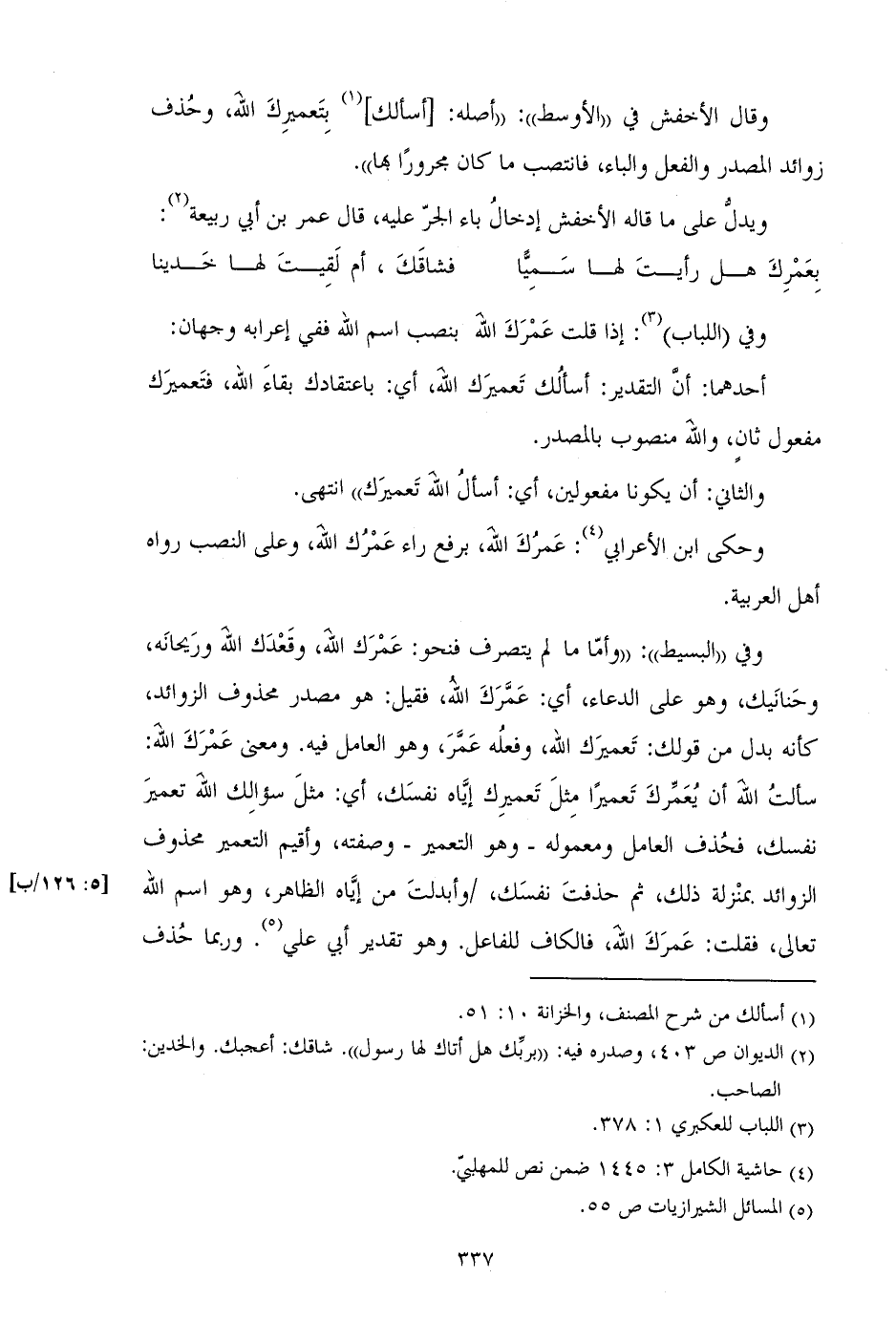وقال الأخفش في ((الأوسط)): ((أصله: [أسألك] بتعميرك الله، وحذف زوائد المصدر والفعل والباء، فانتصب ما كان مجرورا بها)).
