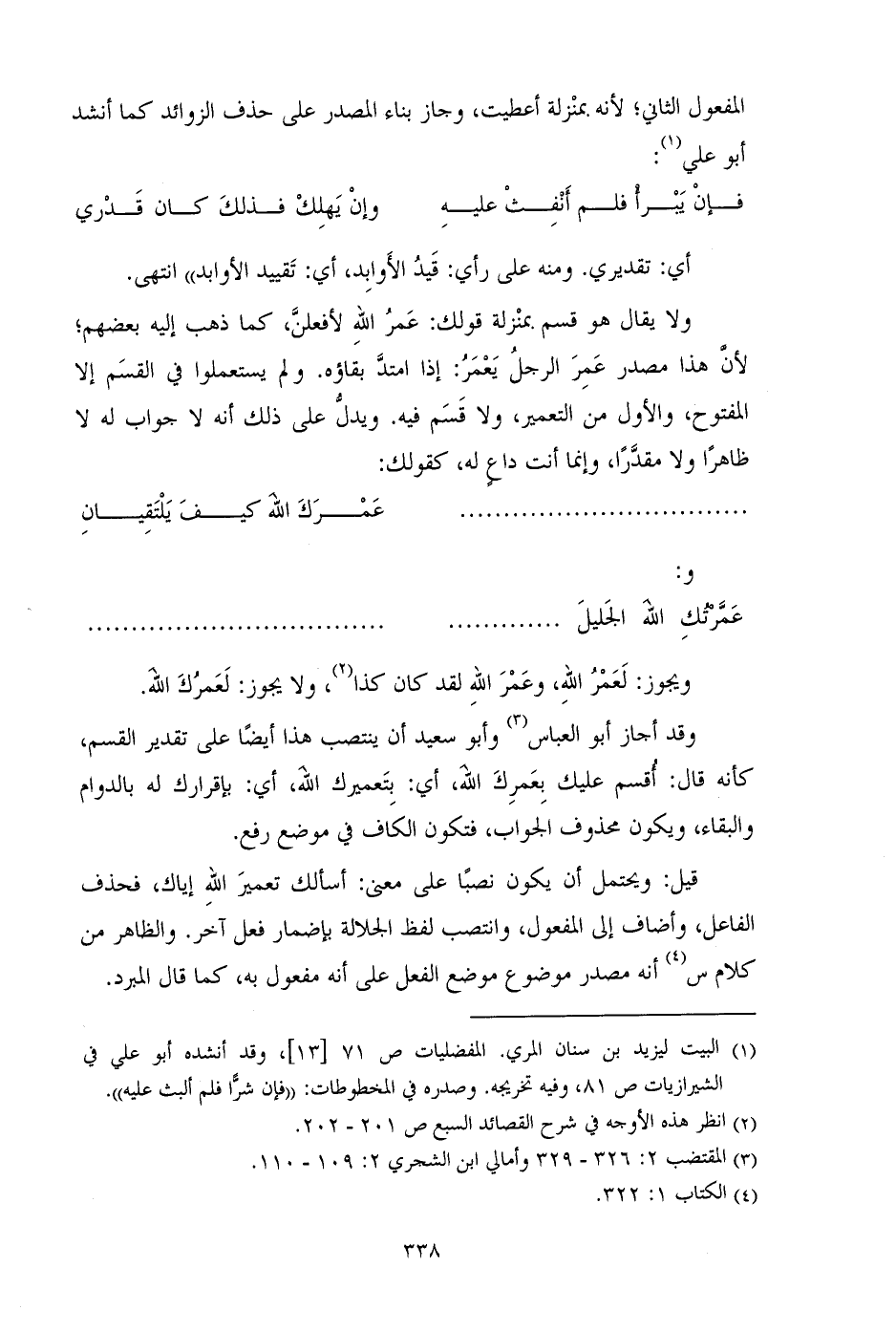 ولا يقال هو قسم بمنزلة قولك: عمر الله لأفعلن، كما ذهب إليه بعضهم؛ لأن هذا مصدر عمر الرجل يعمر: إذا امتد بقاؤه. ولم يستعملوا في القسم إلا المفتوح، والأول من التعمير، ولا قسم فيه. ويدل على ذلك أنه لا جواب له لا ظاهرا ولا مقدرا، وإنما أنت داع له، كقولك: