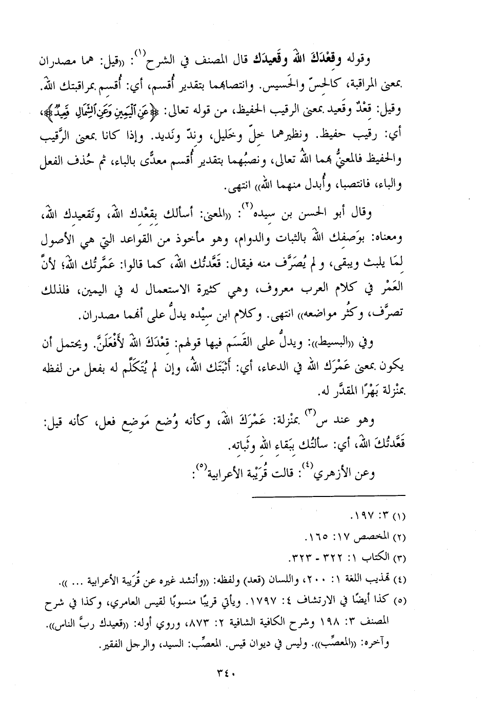 وقال أبو الحسن بن سيده: ((المعنى: أسألك بقعدك الله، وتقعيدك الله ومعناه: بوصفك الله بالثبات والدوام، وهو مأخوذ من القواعد التي هي الأصول لما يلبث ويبقى، ولم يصرف منه فيقال: قعدتك الله، كما قالوا: عمرتك الله؛ لأن العمر في كلام العرب معروف، وهي كثيرة الاستعمال له في اليمين، فلذلك تصرف، وكثر مواضعه)) انتهى. وكلام ابم سيده يدل على أنهما مصدران.
