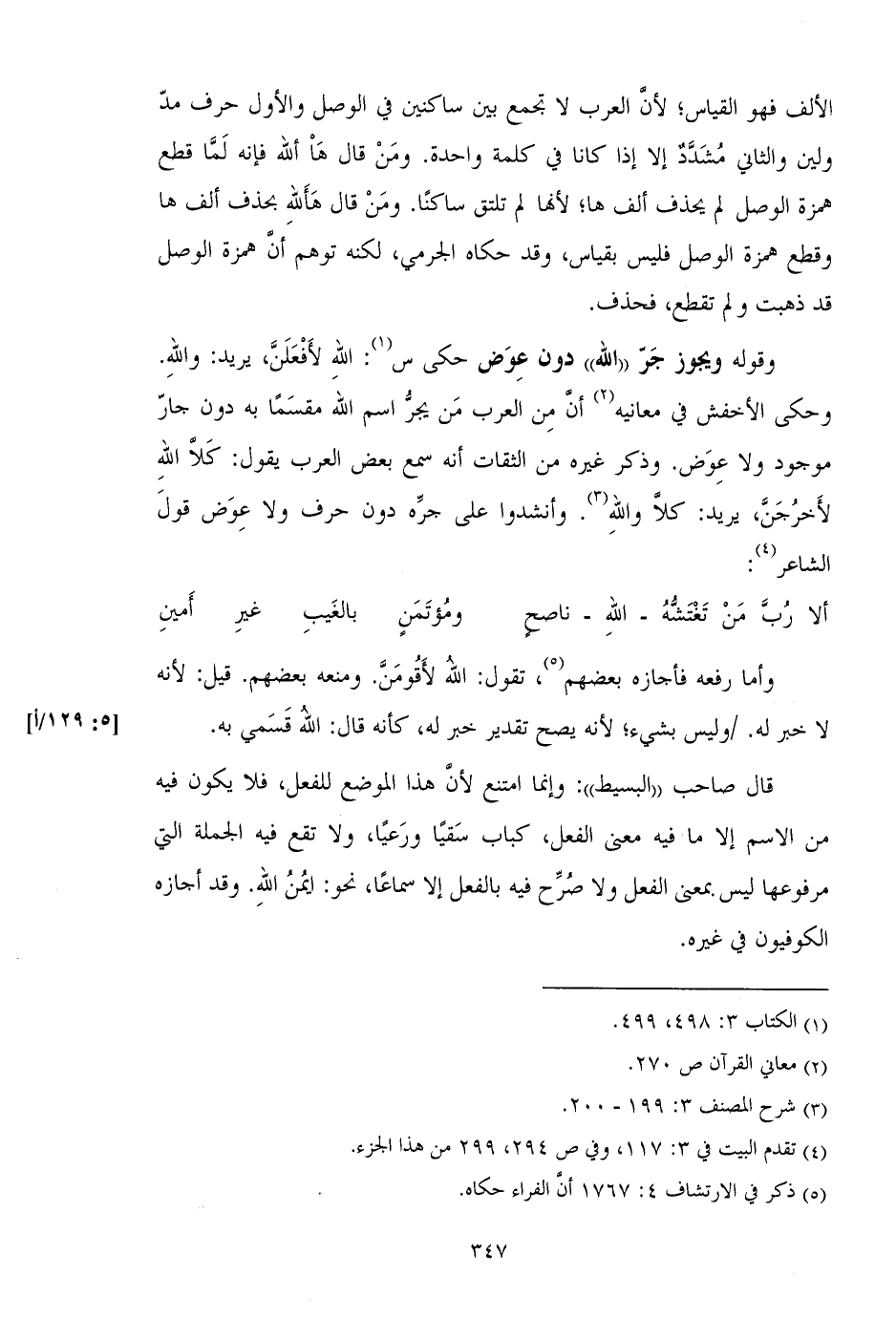 وقوله ويجوز جر ((الله)) دون عوض حكى س: الله لأفعلن، يريد: والله وحكى الأخفش في معانيه أن من العرب من يجر اسم الله مقسما به دون جار موجود ولا عوض. وذكر غيره من الثقات أنه سمع بعض العرب يقول: كلا الله لأخرجن، يريد: كلا والله. وأنشدوا على جره دون حرف ولا عوض قول الشاعر: