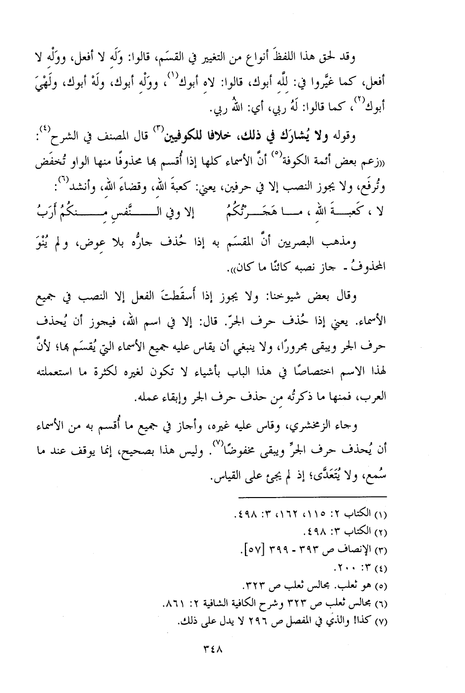 وقوله ولا يشارك في ذلك، خلافا للكوفيين قال المصنف في الشرح: ((زعم بعض أئمة الكوفة أن الأسماء كلها إذا أقسم بها محذوفا منها الواو تخفض وترفع، ولا يجوز النصب إلا في حرفين، يعني: كعبة الله، وقضاء الله، وأنشد:
