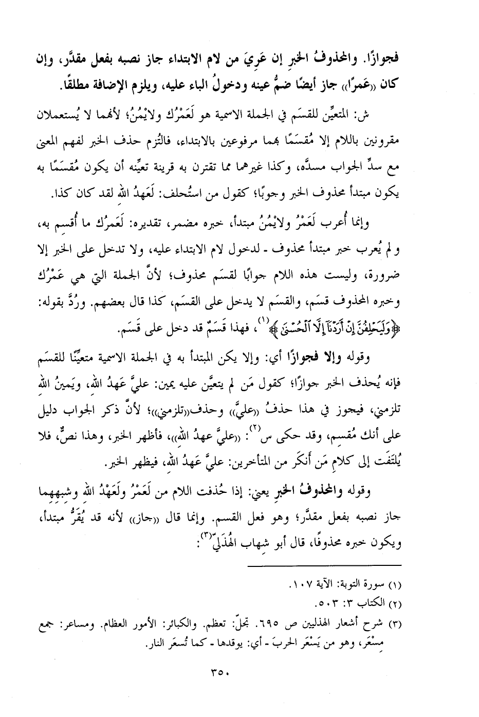 ش: المتعين للقسم في الجملة الاسمية هو لعمرك ولايمن؛ لأنهما لا يستعملان مقرونين باللام إلا مقسما بهما مرفوعين بالابتداء، فالتزم حذف الخبر لفهم المعنى مع سد الجواب مسده، وكذا غيرهما مما تقترن به قرينة تعينه أن يكون مقسما به يكون مبتدأ محذوف الخبر وجوبا؛ كقول من استحلف: لعهد الله لقد كان كذا.