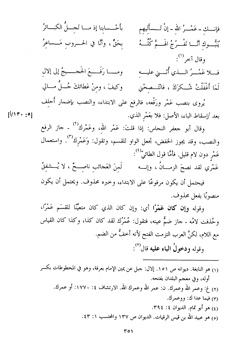 وقال أبو جعفر النحاس: إذا قلت: عمر الله، وعمرك_ جاز الرفع والنصب، وقد يجوز الخفض، تجعل الواو للقسم، وتقول: وعمرك. واستعمال عمر دون لام قليل. فأما قول الطائي: