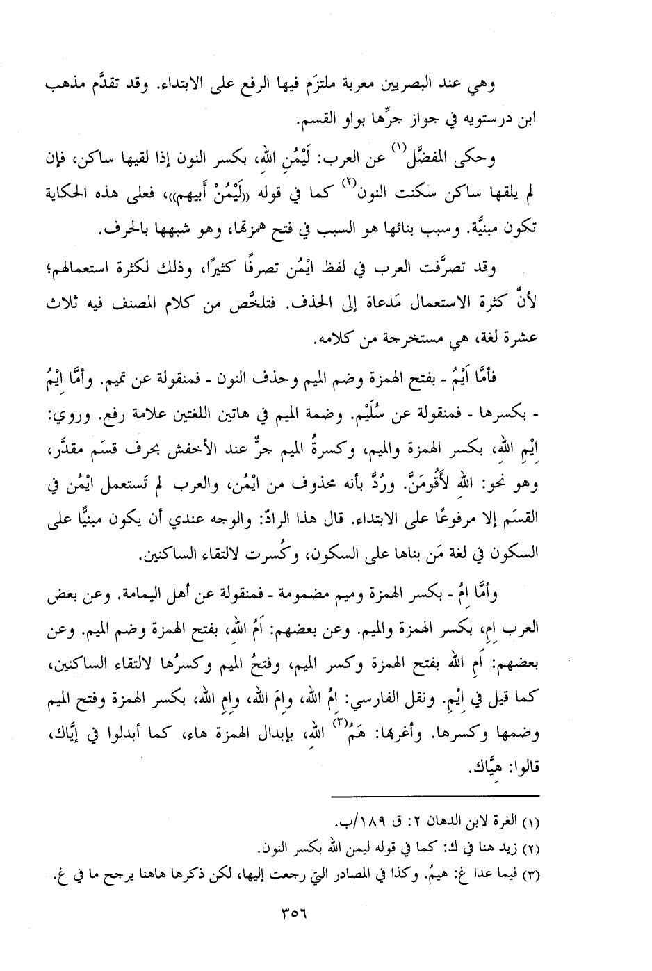وأما ام_ بكسر الهمزة وميم مضمومة_ فمنقولة عن أهل اليمامة. وعن بعض العرب ام، بكسر الهمزة والميم. وعن بعضهم: أم الله، بفتح الهمزة وضم الميم. وعن بعضهم: أم الله بفتح الهمزة وكسر الميم، وفتح الميم وكسرها لالتقاء الساكنين، كما قيل في ايم. ونقل الفارسي: ام الله، وام الله، وام الله، بكسر الهمزة وفتح الميم وضمها وكسرها. وأغربها: هم الله، بإبدال الهمزة هاء، كما أبدلوا في إياك، قالوا: هياك.