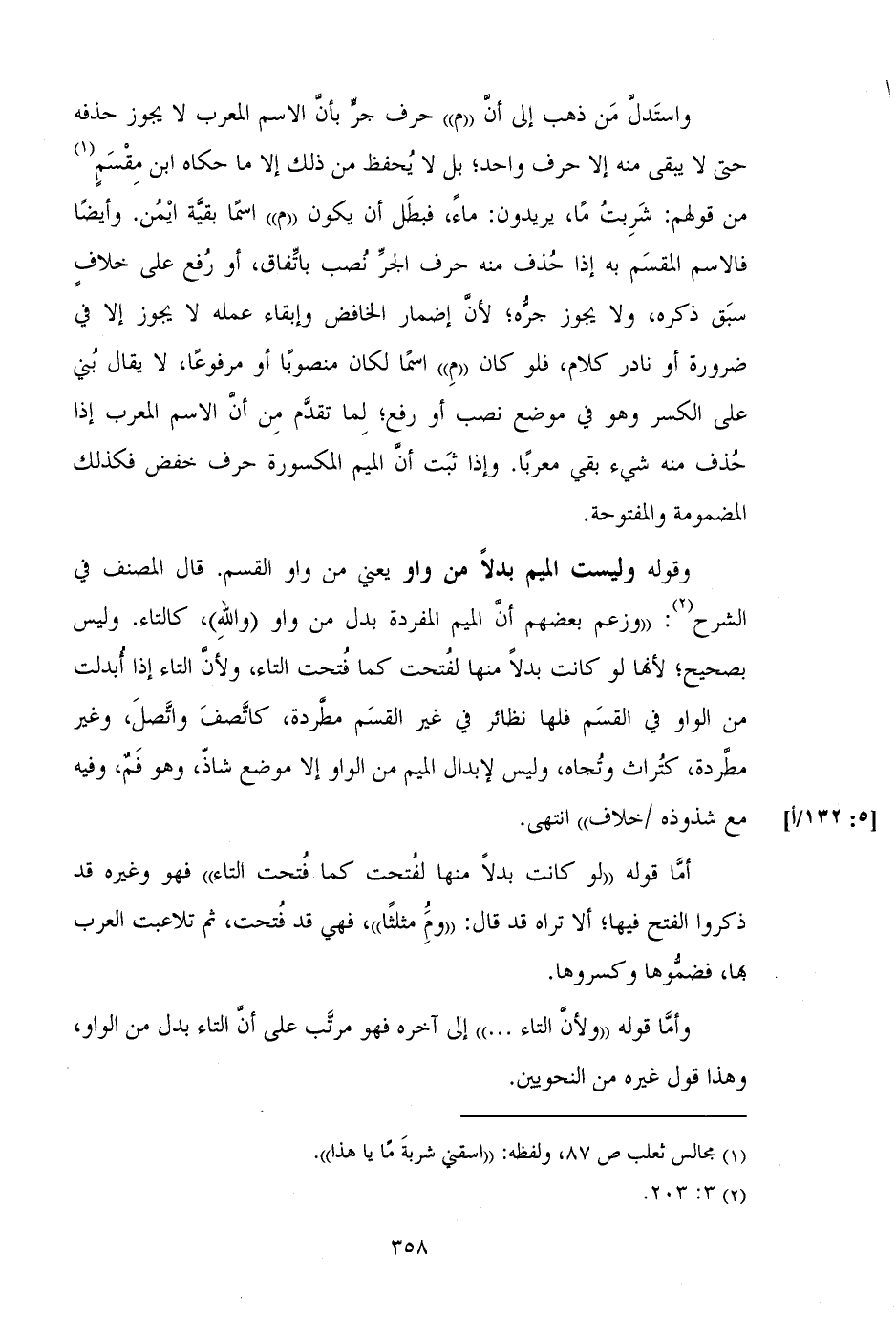 واستدل من ذهب إلى أن ((م)) حرف جر بأن الاسم المعرب لا يجوز حذفه حتى لا يبقى منه إلا حرف واحد؛ بل لا يحفظ من ذلك إلا ما حكاه ابن مقسم من قولهم: شربت ما، يريدون: ماء، فبطل أن يكون ((م)) اسما بقية ايمن. وأيضا فالاسم المقسم به إذا حذف منه حرف الجر نصب باتفاق، أو رفع على خلاف سبق ذكره، ولا يجوز جره؛ لأن إ ١ مار الخافض وإبقاء عمله لا يجوز إلا في ضرورة أو نادر كلام، فلو كان ((م)) اسما لكان منصوبا أو مرفوعا، لا يقال بني على الكسر وهو في موضع نصب أو رفع؛ لما تقدم من أن الاسم المعرب إذا حذف منه شيء بقي معربا. وإذا ثبت أن الميم المكسورة حرف خفض فكذلك المضمومة والمفتوحة.