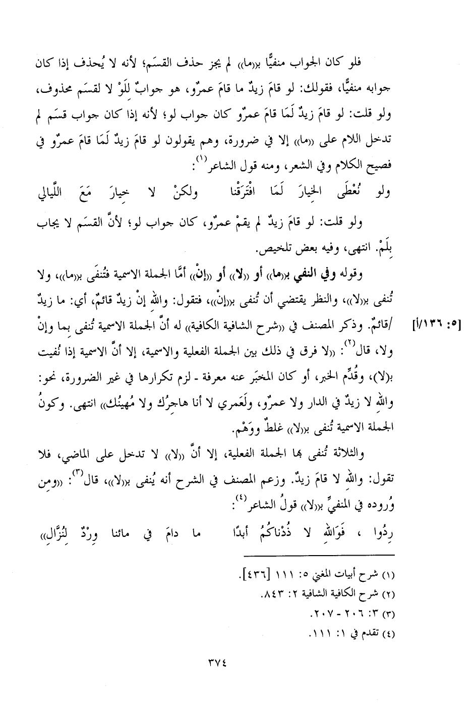 فلو كان الجواب منفيا ب ((ما)) لم يجز حذف القسم؛ لأنه لا يحذف إذا كان جوابه منفيا، فقولك: لو قام زيد ما قام عمرو، هو جواب للولا لقسم محذوف، ولو قلت: لو قام زيد لما قام عمرو كان جواب لو؛ لأنه إذا كان جواب قسم لم تدخل اللام على ((ما)) إلا في ضرورة، وهم يقولون لو قام زيد لما قام عمرو في فصيح الكلام وفي الشعر، ومنه قول الشاعر: