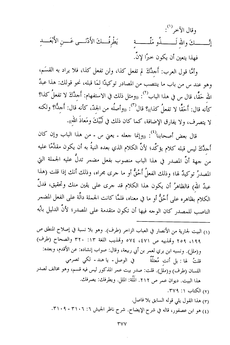 وأما قول العرب: أجدك لم تفعل كذا، ولن تفعل كذا، فلا يراد به القسم، وهو عند س من باب ما ينتصب من المصادر توكيدا لما قبله، نحو قولك: هذا عبد الله حقا، قال س في هذا البا: ((ومثل ذلك في الاستفهام: أجدك لا تفعل كذا؟ كأنه قال: أحقا لا تفعل كذا))؟ قال: ((وأصله من الجد، كأنه قال: أجدا؟ ولكنه لا يتصرف، ولا يفارق الإضافة، كما كان ذلك في لبيك ومعاذ الله)).