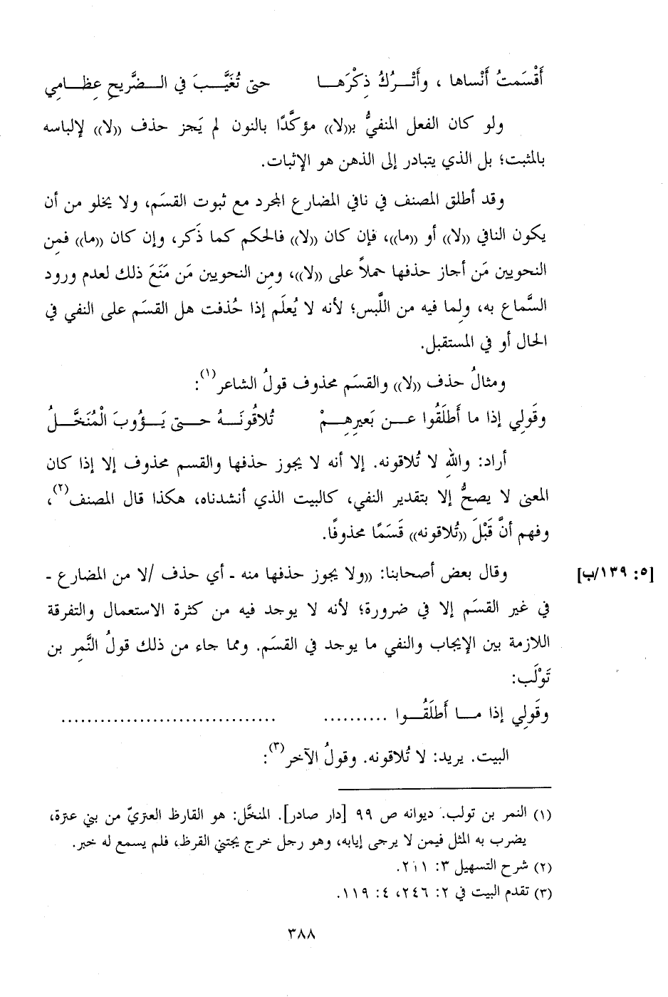 وقال بعض اصحابنا: "ولا يجوز حذفها منه- أي حذف/ لا من المضارع- في غير القسم إلا في ضرورة؛ لأنه لا يوجد فيه من كثرة الاستعمال والتفرقة اللازمة بين الإيجاب والنفي ما يوجد في القسم. ومما جاء من ذلك قول النمر بن تولب: