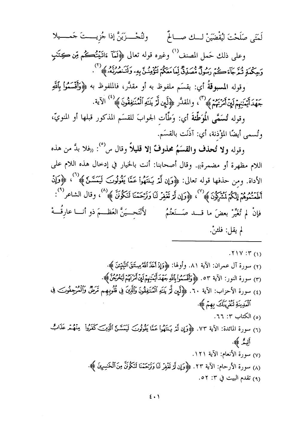 وقوله ولا تحذف والقسم محذوف إلا قليلاً وقال س: "فلابد من هذه اللام مظهرة او مضرة". وقال أصحابنا: أنت بالخيار في إدخال هذه اللام علي الأداة. ومن حذفها قوله تعالى: {وَإِنْ لَمْ يَنتَهُوا عَمَّا يَقُولُونَ لَيَمَسَّنَّ}، {وَإِنْ أَطَعْتُمُوهُمْ إِنَّكُمْ لَمُشْرِكُونَ}، {وَإِنْ لَمْ تَغْفِرْ لَنَا وَتَرْحَمْنَا لَنَكُونَنّ}، وقال الشاعر: فإن لم تغير بعض ما قد صنعتم ... لانتحين العظم ذو أنا عارقه