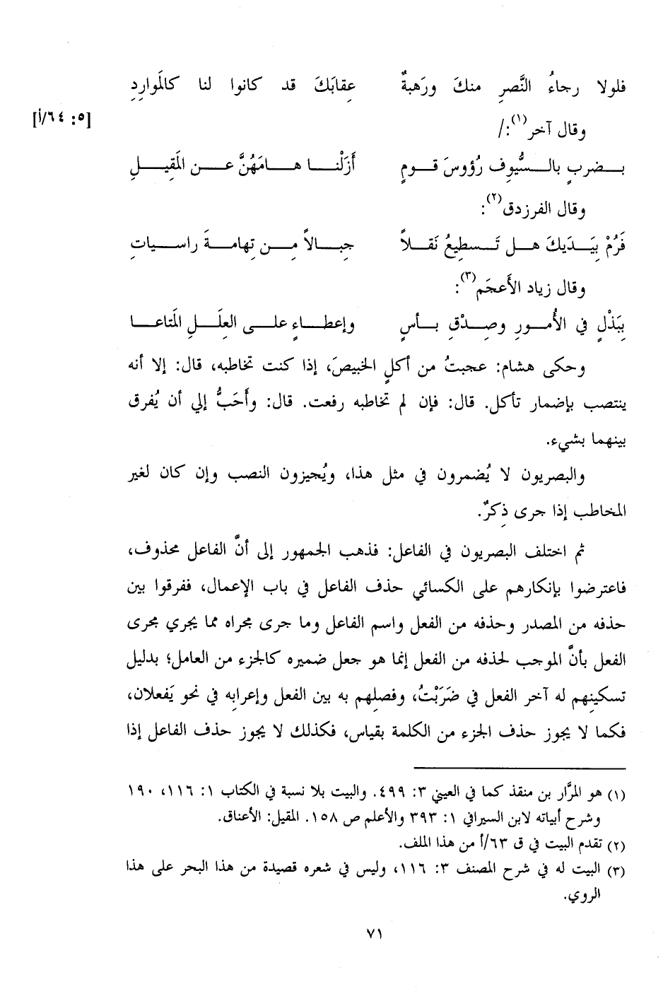 ثم اختلف البصريون في الفاعل: فذهب الجمهور إلى أن الفاعل محذوف، فاعترضوا بإنكارهم على الكسائي حذف الفاعل في باب الإعمال، ففرقوا بين حذفه من المصدر وحذفه من الفعل واسم الفاعل وما جرى مجراه مما يجري مجرى الفعل بأن الموجب لحذفه من الفعل إنما هو جعل ضميره كالجزء من العامل؛ بدليل تسكينهم له آخر الفعل في ضربت، وفصلهم به بين الفعل وإعرابه في نحو يفعلان، فكما لا يجوز حذف الجزء من الكلمة بقياس، فكذلك لا يجوز حذف الفاعل إذا