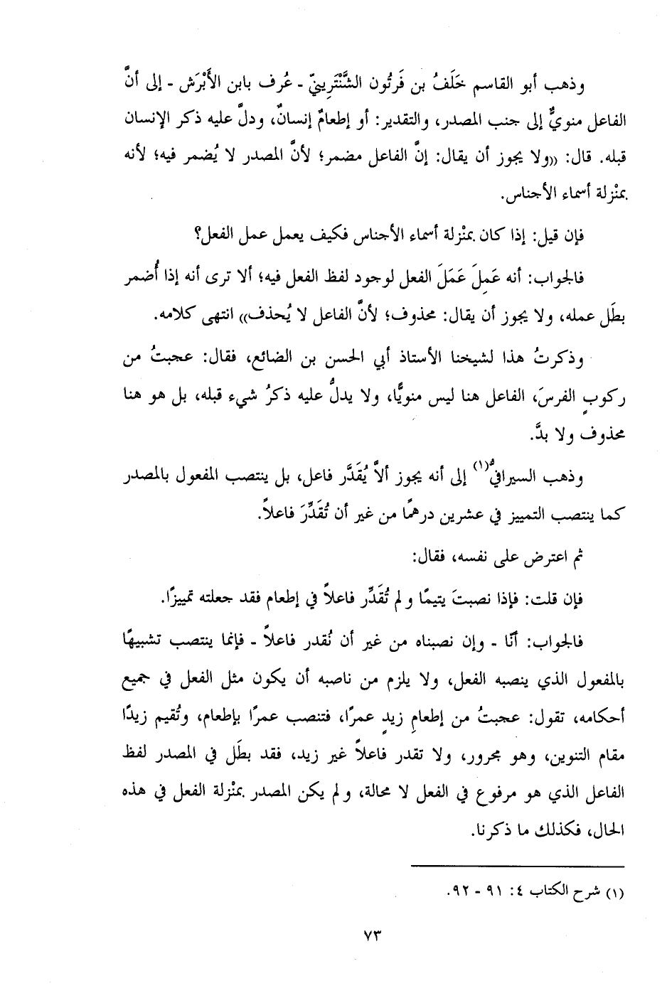 فالجواب: أنا - وإن نصبناه من غير أن نقدر فاعلاً - فإنما ينتصب تشبيهاً بالمفعول الذي ينصبه الفعل، ولا يلزم من ناصبه أن يكون مثل الفعل في جميع أحكامه، تقول: عجبت من إطعام زيد عمراً، فتنصب عمراً بإطعام، وتقيم زيداً مقام التنوين، وهو مجرور، ولا تقدر فاعلاً غير زيد، فقد بطل في المصدر لفظ الفاعل الذي هو مرفوع في الفعل لا محالة، ولم يكن المصدر بمنزلة الفعل في هذه الحال، فكذلك ما ذكرنا.