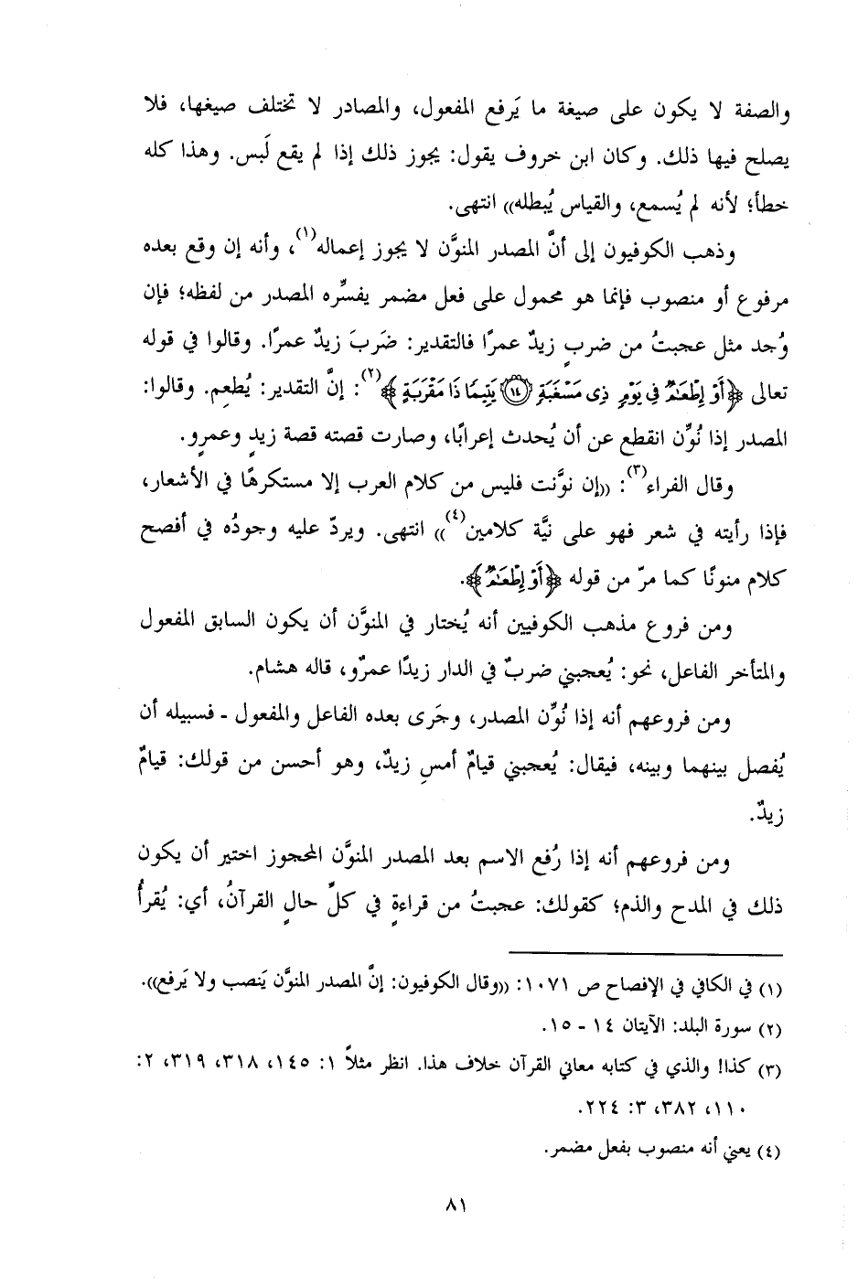 وذهب الكوفيون إلى أن المصدر المنون لا يجوز إعماله، وأنه إن وقع بعده مرفوع أو منصوب فإنما هو محمول على فعل مضمر يفسره المصدر من لفظه؛ فإن وجد مثل عجبت من ضرب زيد عمراً فالتقدير: ضرب زيد عمراً. وقالوا في قوله تعالى (أَوْ إِطْعَامٌ فِي يَوْمٍ ذِي مَسْغَبَةٍ (١٤) يَتِيمًا ذَا مَقْرَبَةٍ): إن التقدير: يطعم. وقالوا: المصدر إذا نون انقطع عن أن يحدث إعراباً، وصارت قصته قصة زيد وعمرو.