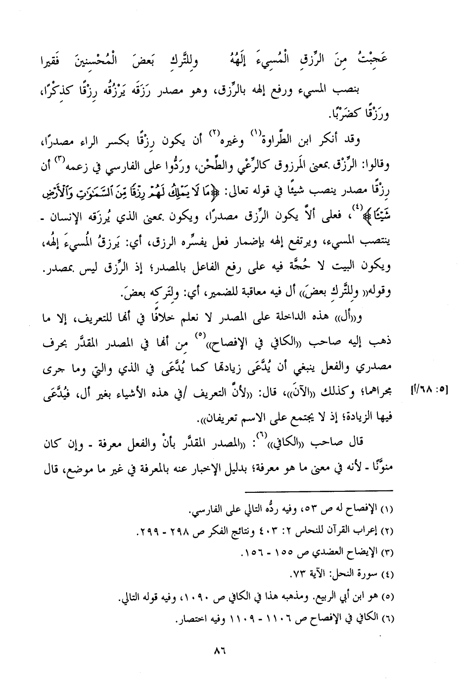 وقد أنكر ابن الطراوة وغيره أن يكون رزقا بكسر الراء مصدراً، وقالوا: الرزق بمعنى المرزوق كالرعي والطحن، وردوا على الفارسي في زعمه أن رزقاً مصدر ينصب شيئاً في قوله تعالى: (مَا لَا يَمْلِكُ لَهُمْ رِزْقًا مِنَ السَّمَاوَاتِ وَالْأَرْضِ شَيْئًا)، فعلى ألا يكون الرزق مصدراً، ويكون بمعنى الذي يرزقه الإنسان - ينتصب المسيء، ويرتفع إلهه بإضمار فعل يفسره الرزق، أي: يرزق المشيء إلهه، ويكون البيت لا حجة فيه على رفع الفاعل بالمصدر؛ إذ الرزق ليس بمصدر. وقوله "وللترك بعض" أل فيه معاقبة للضمير، أي: ولتركه بعض.