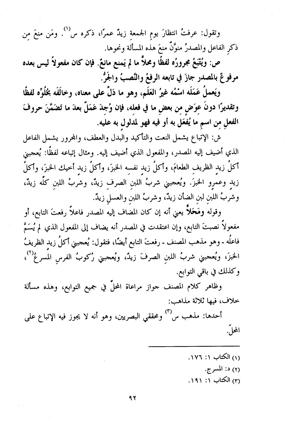ش: الإتباع يشمل النعت والتأكيد والبدل والعطف، والمجرور يشمل الفاعل الذي أضيف إليه المصدر، والمفعول الذي أضيف إليه. ومثال إتباعه لفظاً: يعجبني أكل زيد الظريف الطعام، وأكل زيد نفسه الخبز، وأكل زيد أخيك الخبز، وأكل زيد وعمرو الخبز. ويعجبني شرب اللبن الصرف زيد، وشرب اللبن كله زيد، وشرب اللبن لبن الضأن زيد، وشرب اللبن والعسل زيد.