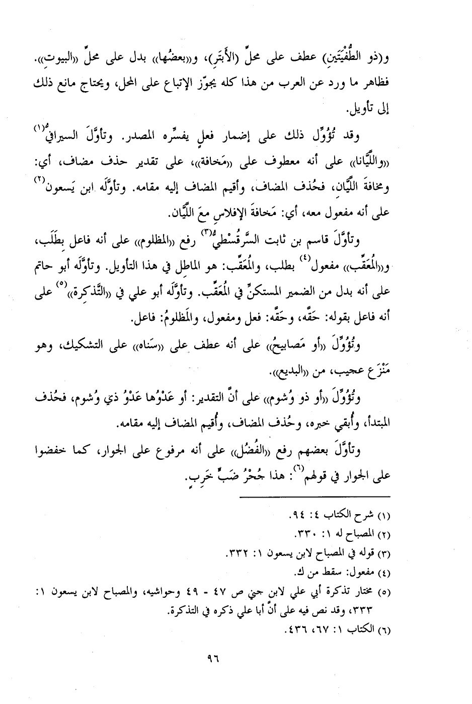 وقد تؤول ذلك على إضمار فعل يفسره المصدر. وتأول السيرافي "والليانا" على أنه معطوف على "مخافة"، على تقدير حذف مضاف، أي: ومخافة الليان، فحذف المضاف، وأقيم المضاف إليه مقامه. وتأوله ابن يسعون على أنه مفعول معه، أي: مخافة الإفلاس مع الليان.