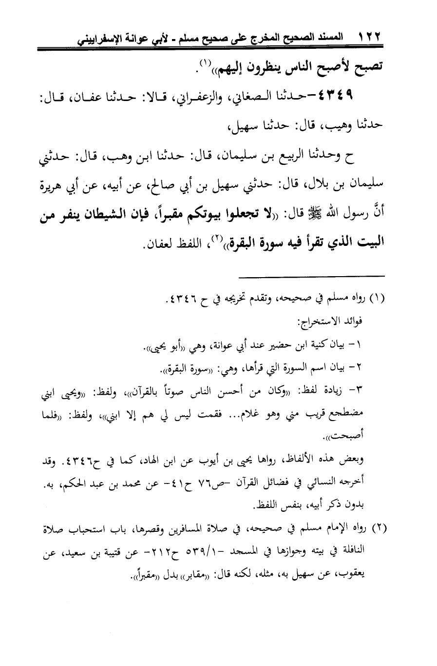 ح وحدثنا الربيع بن سليمان، قال: حدثنا ابن وهب، قال: حدثني سليمان بن بلال، قال: حدثني سهيل بن أبي صالح، عن أبيه، عن أبي هريرة أنَّ رسول الله -صلى الله عليه وسلم- قال: "لا تجعلوا بيوتكم مقبرًا، فإن الشيطان ينفر من البيت الذي تقرأ فيه سورة البقرة" (¬1)، اللفظ لعفان.