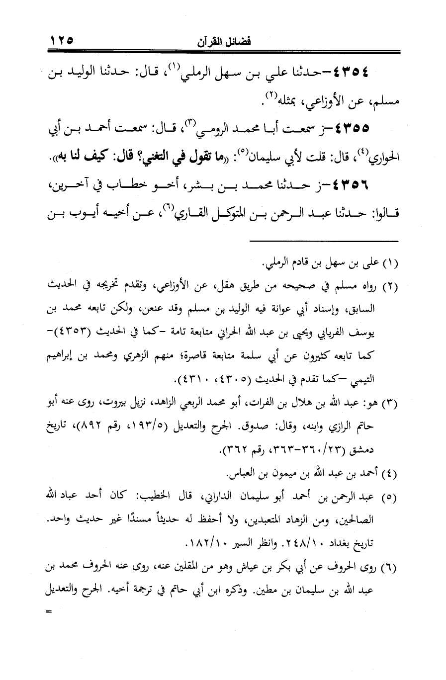 4355 - ز سمعت أبا محمَّد الرومي (¬1)، قال: سمعت أحمد بن أبي الحواري (¬2)، قال: قلت لأبي سليمان (¬3): "ما تقول في المغني؟ قال: كيف لنا به".