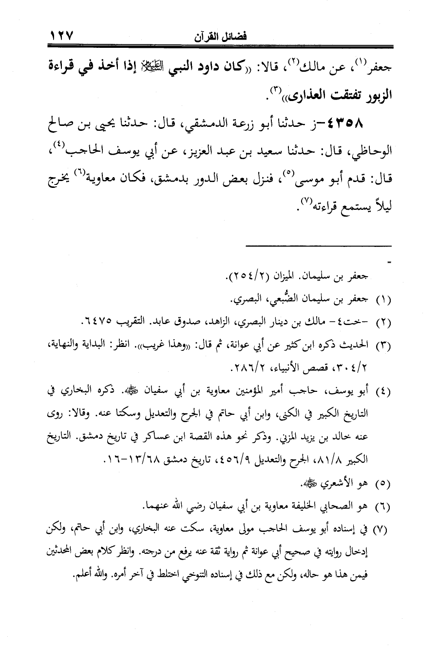 4358 - ز حدثنا أبو زرعة الدمشقي، قال: حدثنا يحيى بن صالح الوحاظي، قال: حدثنا سعيد بن عبد العزيز، عن أبي يوسف الحاجب (¬1)، قال: قدم أبو موسى (¬2)، فنزل بعض الدور بدمشق، فكان معاوية (¬3) يخرج ليلًا يستمع قراءته (¬4).