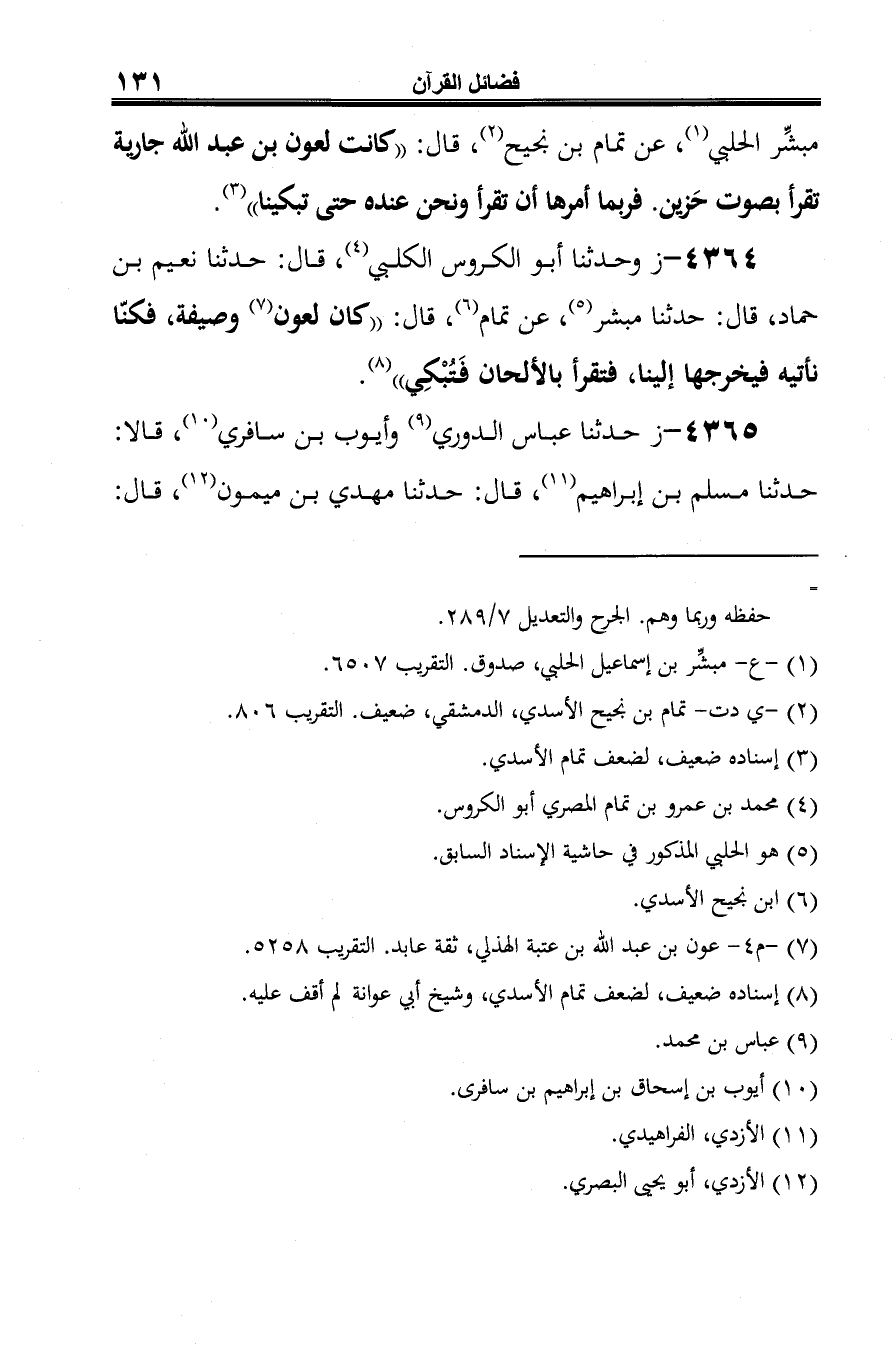 4364 - ز وحدثنا أبو الكروس الكلبي (¬1)، قال: حدثنا نعيم بن حماد، قال: حدثنا مبشر (¬2)، عن تمام (¬3)، قال: "كان لعون (¬4) وصيفة، فكنّا نأتيه فيخرجها إلينا، فتقرأ بالألحان فَتُبْكِي" (¬5).