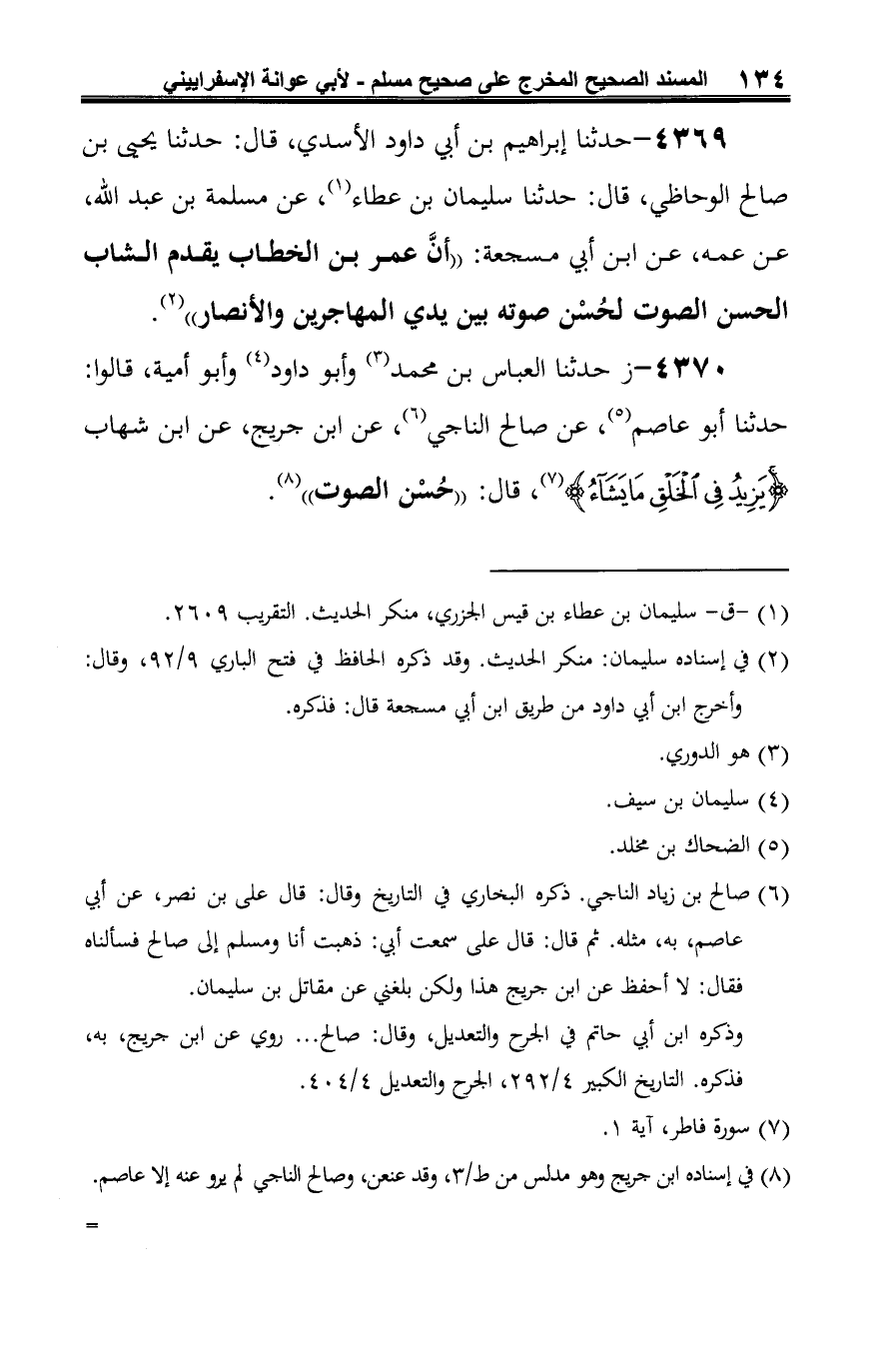 4370 - ز حدثنا العباس بن محمَّد (¬1) وأبو داود (¬2) وأبو أمية، قالوا: حدثنا أبو عاصم (¬3)، عن صالح الناجي (¬4)، عن ابن جريج، عن ابن شهاب {يَزِيدُ في الْخَلْقِ مَا يَشَاءُ} (¬5)، قال: "حُسْن الصوت" (¬6).