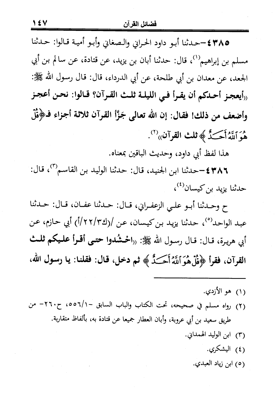 4385 - حدثنا أبو داود الحراني والصغاني وأبو أمية قالوا: حدثنا مسلم بن إبراهيم (¬1)، قال: حدثنا أبان بن يزيد، عن قتادة، عن سالم بن أبي الجعد، عن معدان بن أبي طلحة، عن أبي الدرداء، قال: قال رسول الله -صلى الله عليه وسلم-: "أيعجز أحدكم أن يقرأ في الليلة ثلث القرآن؟ قالوا: نحن أعجز وأضعف من ذلك! فقال: إن الله تعالى جَزَّأ القرآن ثلاثة أجزاء فـ {قُلْ هُوَ اللَّهُ أَحَدٌ} ثلث القرآن" (¬2).