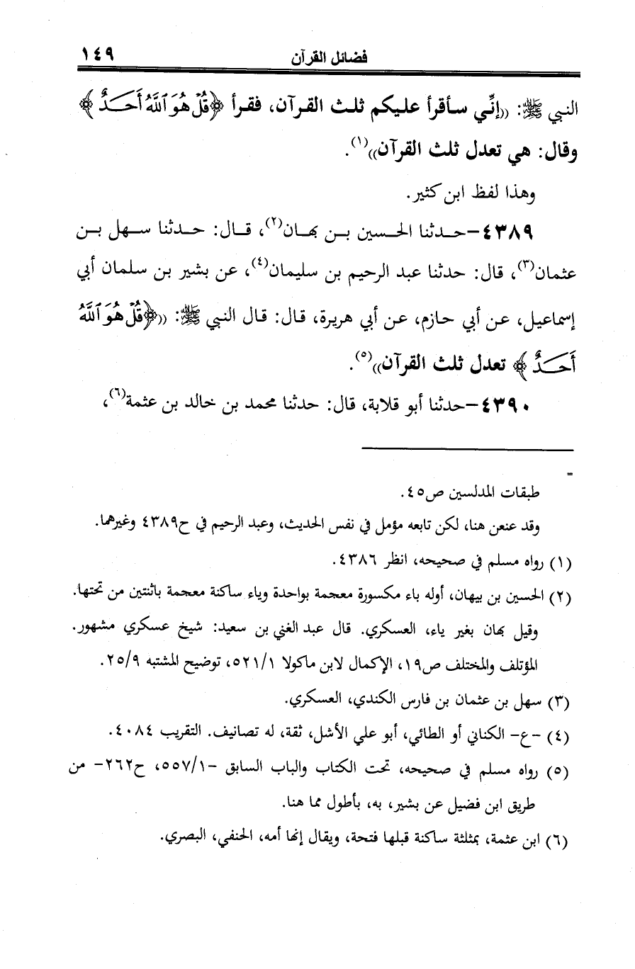 4389 - حدثنا الحسين بن بهان (¬1)، قال: حدثنا سهل بن عثمان (¬2)، قال: حدثنا عبد الرحيم بن سليمان (¬3)، عن بشير بن سلمان أبي إسماعيل، عن أبي حازم، عن أبي هريرة، قال: قال النبي -صلى الله عليه وسلم-: " {قُلْ هُوَ اللَّهُ أَحَدٌ} تعدل ثلث القرآن" (¬4).