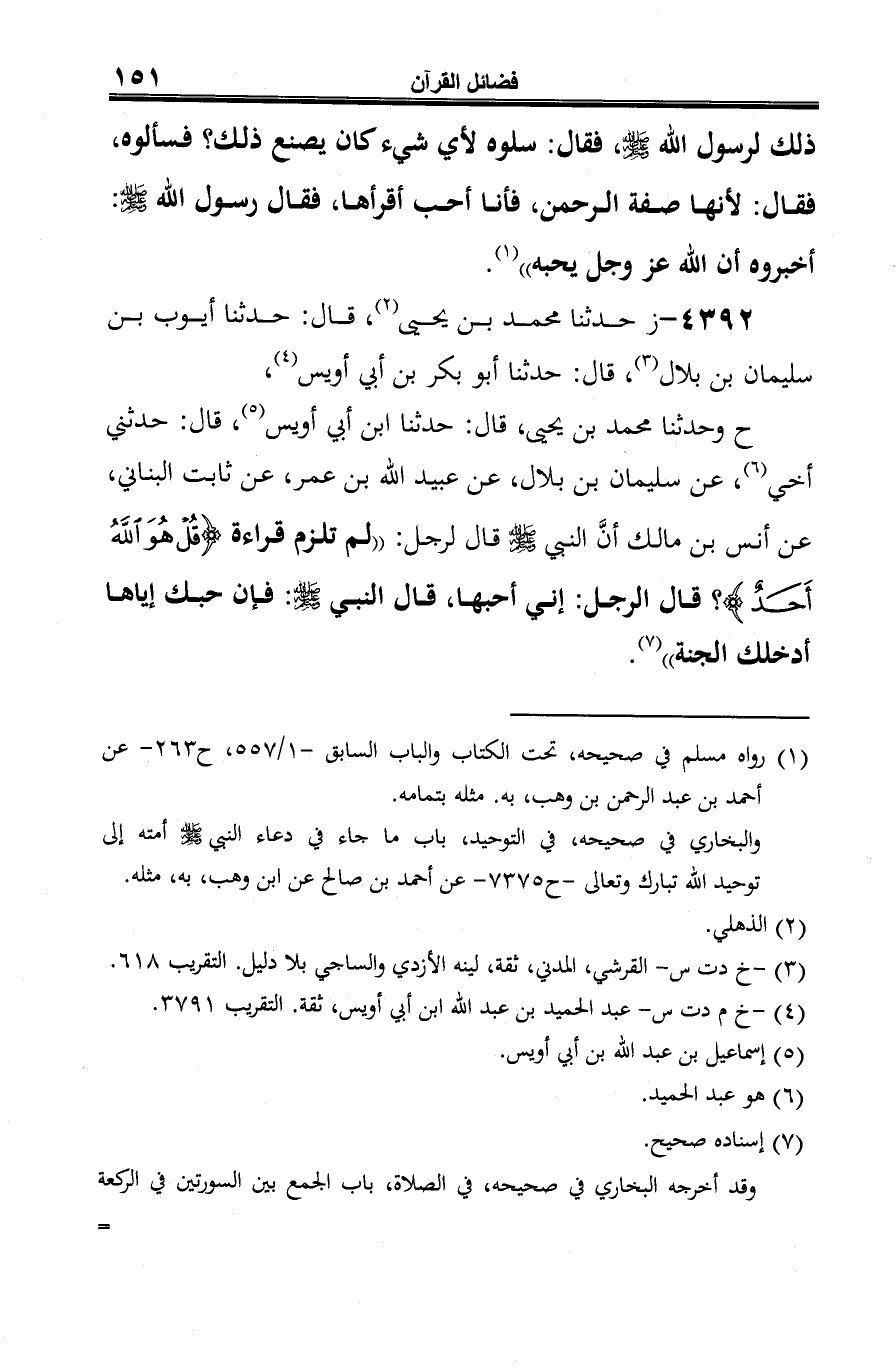 -[152]- ز حدثنا ابن أبي الجحيم، قال: حدثنا إبراهيم بن حمزة (¬7)، قال: حدثنا عبد العزيز بن محمَّد (¬8)، عن عبيد الله بن عمر عن ثابت، عن أنس: "أنّ رجلًا قال: يا رسول الله إني أحب {قُلْ هُوَ اللَّهُ أَحَدٌ}، قال: حبك إيّاها أدخلك الجنة" (¬9).