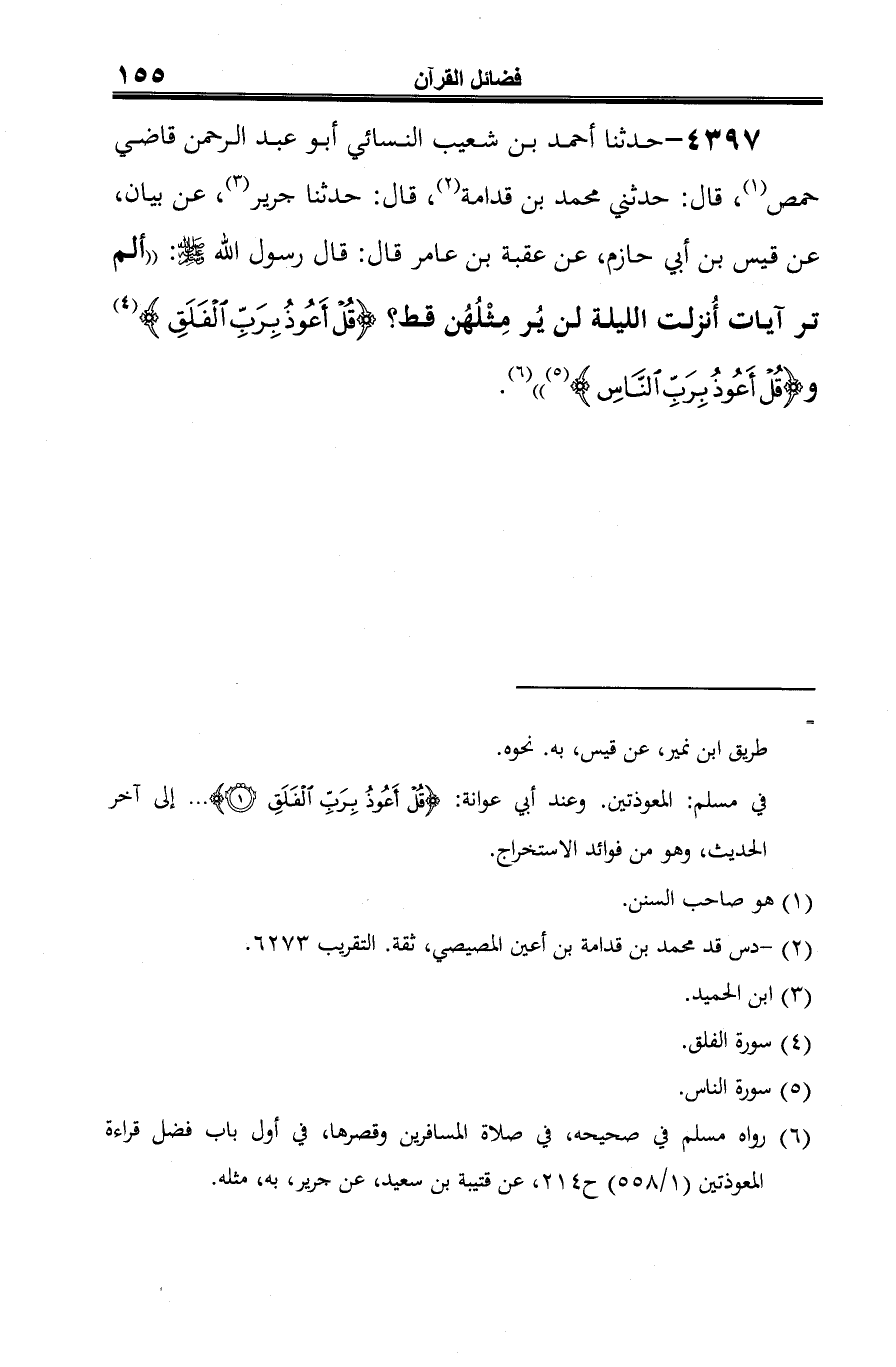 4397 - حدثنا أحمد بن شعيب النسائي أبو عبد الرحمن قاضي حمص (¬1)، قال: حدثني محمَّد بن قدامة (¬2)، قال: حدثنا جرير (¬3)، عن بيان، عن قيس بن أبي حازم، عن عقبة بن عامر قال: قال رسول الله -صلى الله عليه وسلم-: "ألم تر آيات أُنزلت الليلة لن يُر مِثْلُهُن قط؟ {قُلْ أَعُوذُ بِرَبِّ الْفَلَقِ} (¬4) و {قُلْ أَعُوذُ بِرَبِّ النَّاسِ} (¬5) " (¬6).