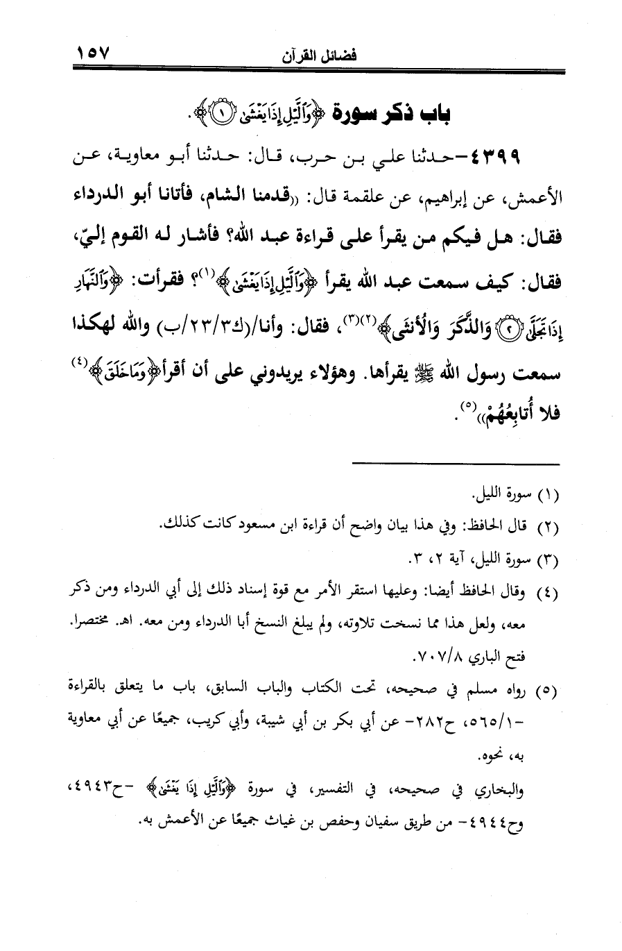 4399 - حدثنا علي بن حرب، قال: حدثنا أبو معاوية، عن الأعمش، عن إبراهيم، عن علقمة قال: "قدمنا الشام، فأتانا أبو الدرداء فقال: هل فيكم من يقرأ على قراءة عبد الله؟ فأشار له القوم إليّ، فقال: كيف سمعت عبد الله يقرأ {وَاللَّيْلِ إِذَا يَغْشَى} (¬1)؟ فقرأت: {وَالنَّهَارِ إِذَا تَجَلَّى (2) وَمَا خَلَقَ الذَّكَرَ وَالْأُنْثَى} (¬2) (¬3)، فقال: وأنا والله لهكذا سمعت رسول الله -صلى الله عليه وسلم- يقرأها. وهؤلاء يريدوني على أن أقرأ {وَمَا خَلَقَ} (¬4) فلا أُتابِعُهُمْ" (¬5).