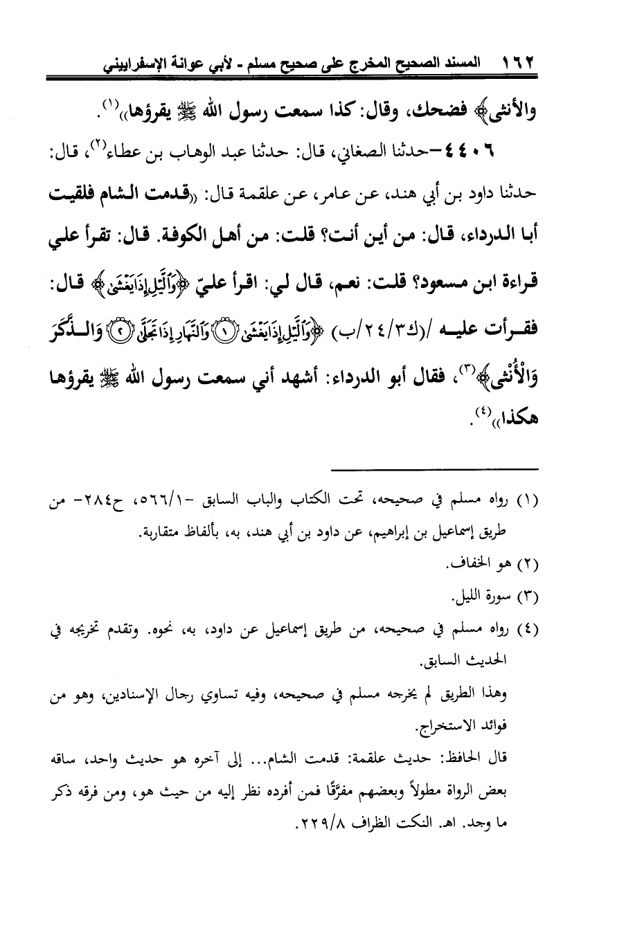4406 - حدثنا الصغاني، قال: حدثنا عبد الوهاب بن عطاء (¬1)، قال: حدثنا داود بن أبي هند، عن عامر، عن علقمة قال: "قدمت الشام فلقيت أبا الدرداء، قال: من أين أنت؟ قلت: من أهل الكوفة. قال: تقرأ علي قراءة ابن مسعود؟ قلت: نعم، قال لي: اقرأ عليّ {وَاللَّيْلِ إِذَا يَغْشَى} قال: فقرأت عليه {وَاللَّيْلِ إِذَا يَغْشَى (1) وَالنَّهَارِ إِذَا تَجَلَّى (2) وَالذَّكَرَ وَالْأُنْثَى} (¬2)، فقال أبو الدرداء: أشهد أني سمعت رسول الله -صلى الله عليه وسلم- يقرؤها هكذا" (¬3).