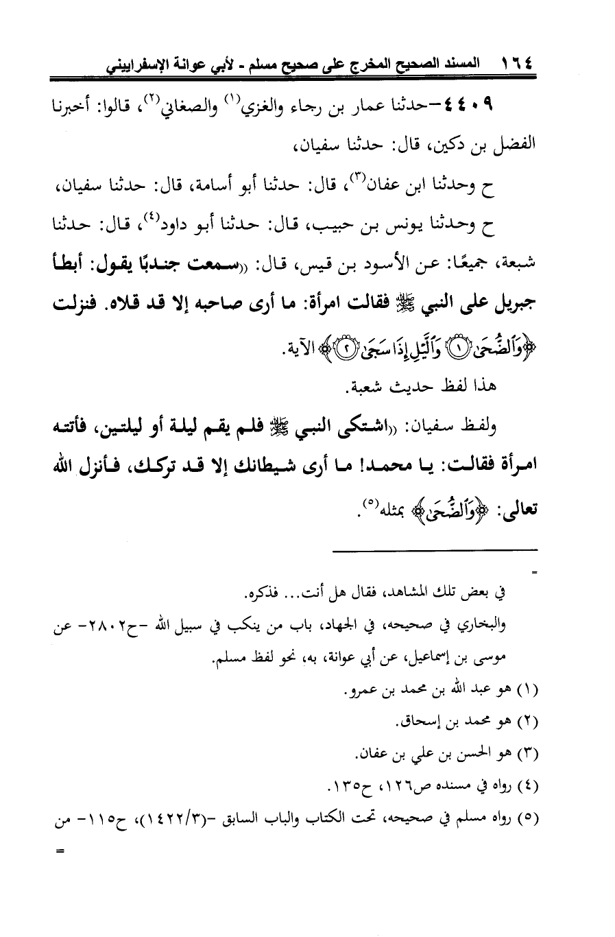ح وحدثنا يونس بن حبيب، قال: حدثنا أبو داود (¬4)، قال: حدثنا شبعة، جميعًا: عن الأسود بن قيس، قال: "سمعت جندبًا يقول: أبطأ جبريل على النبي -صلى الله عليه وسلم- فقالت امرأة: ما أرى صاحبه إلا قد قلاه. فنزلت {وَالضُّحَى (1) وَاللَّيْلِ إِذَا سَجَى (2)} الآية.