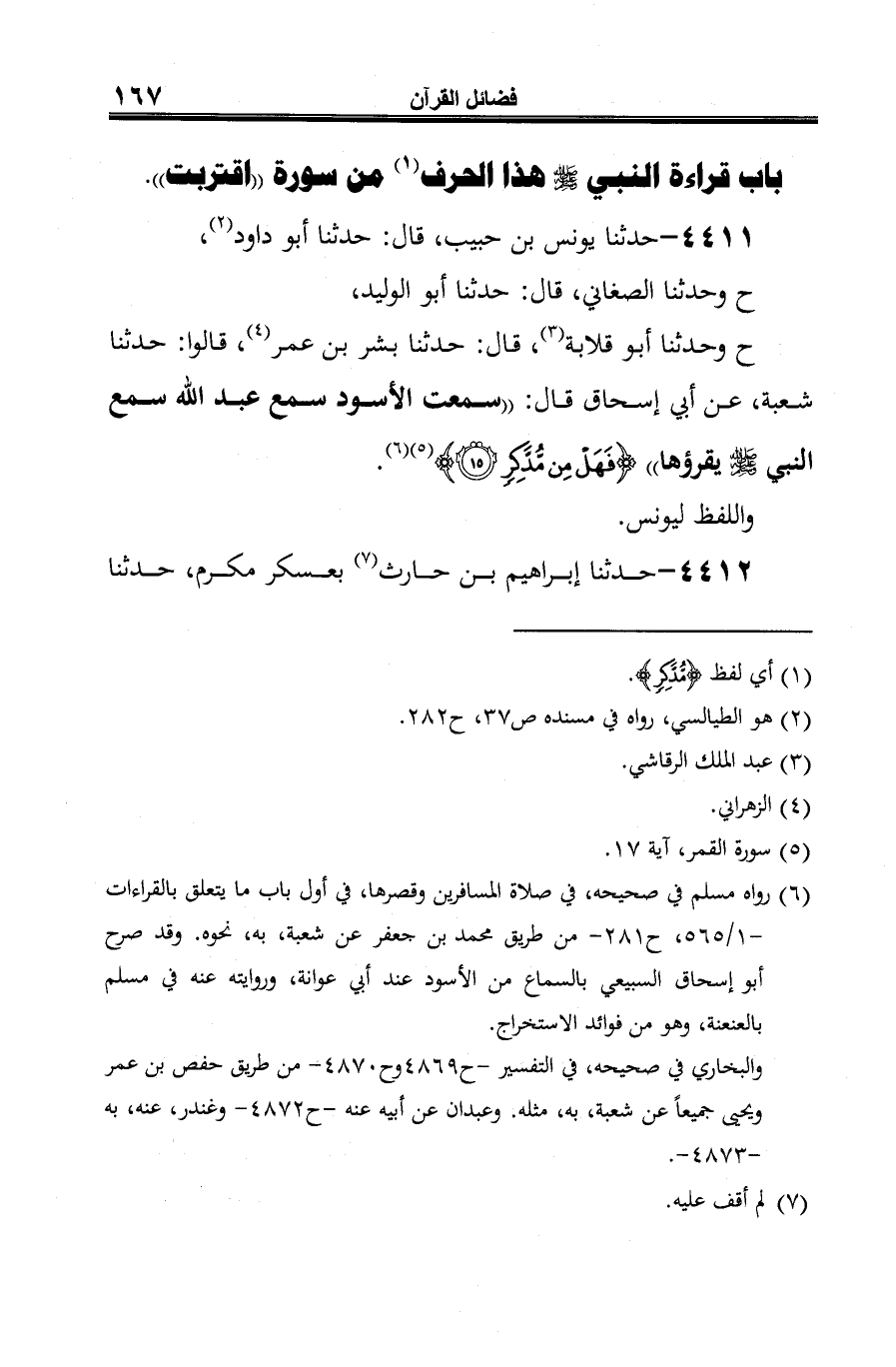 ح وحدثنا أبو قلابة (¬2)، قال: حدثنا بشر بن عمر (¬3)، قالوا: حدثنا شعبة، عن أبي إسحاق قال: "سمعت الأسود سمع عبد الله سمع النبي -صلى الله عليه وسلم- يقرؤها" {فَهَلْ مِنْ مُدَّكِرٍ (15)} (¬4) (¬5).