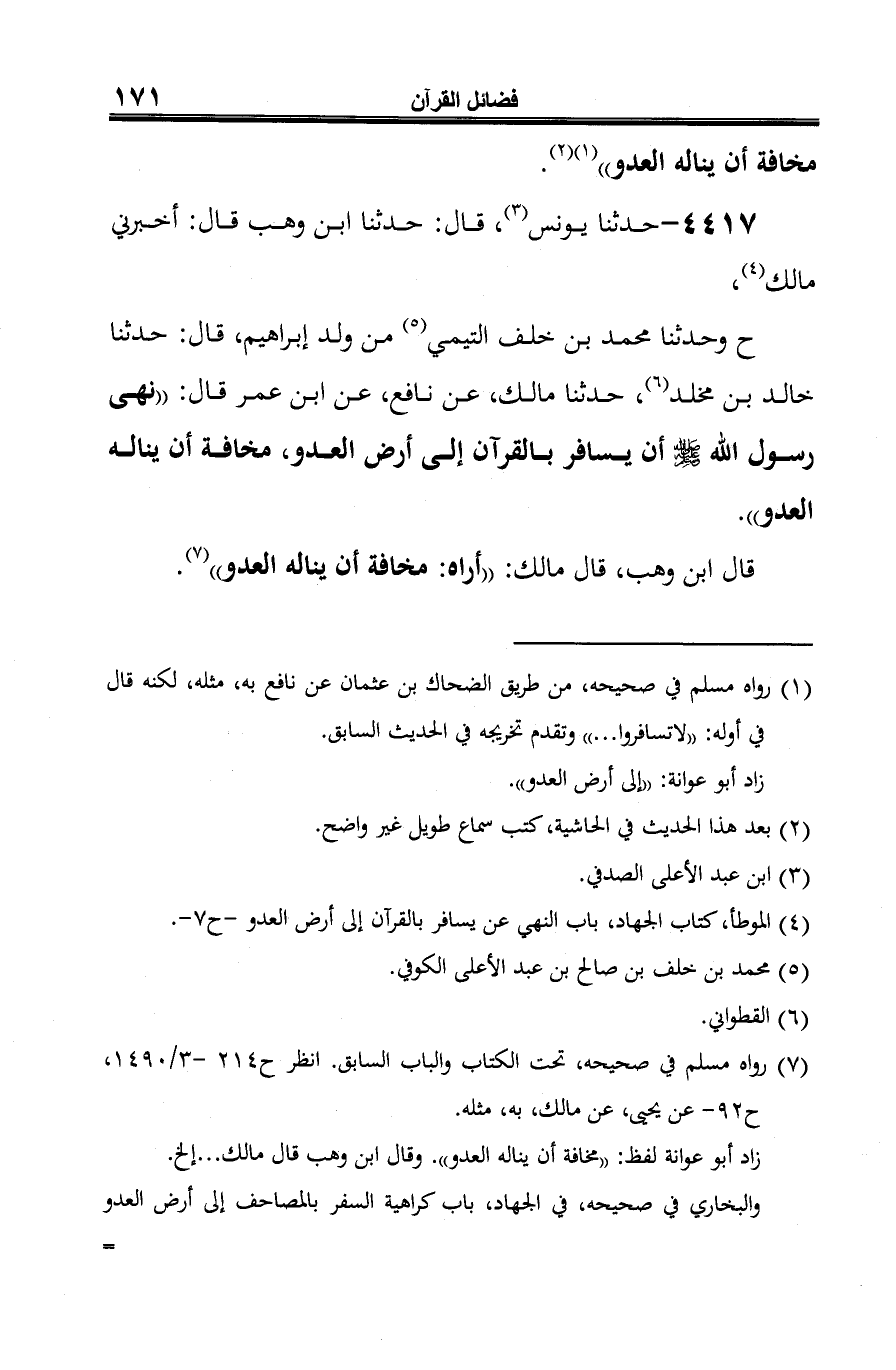 (¬2) الموطأ، كتاب الجهاد، باب النهي عن يسافر بالقرآن إلى أرض العدو - ح 7 - .