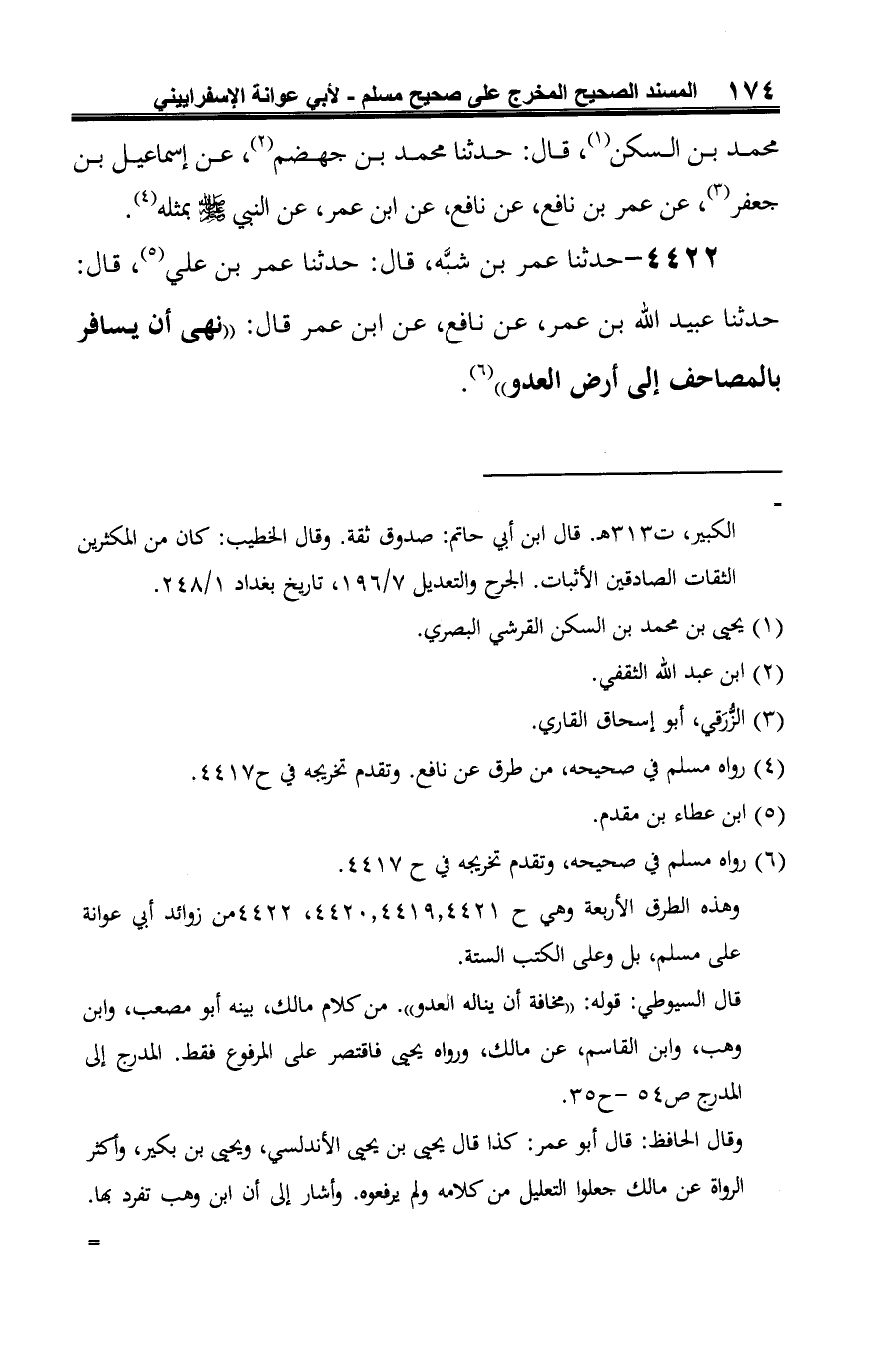 4422 - حدثنا عمر بن شبَّه، قال: حدثنا عمر بن علي (¬1)، قال: حدثنا عبيد الله بن عمر، عن نافع، عن ابن عمر قال: "نهى أن يسافر بالمصاحف إلى أرض العدو" (¬2).