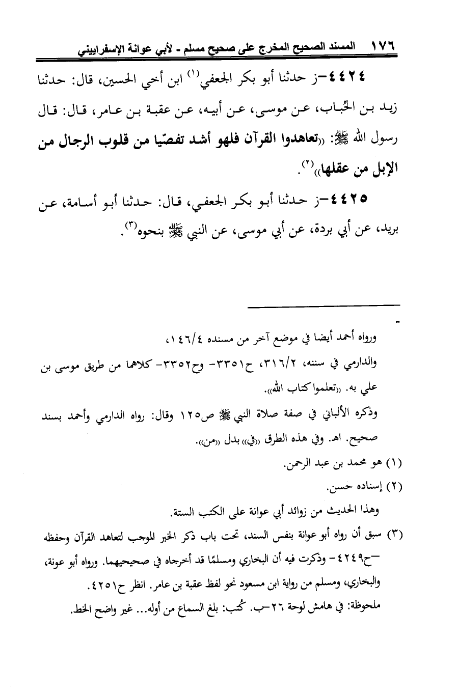 4424 - ز حدثنا أبو بكر الجعفي (¬1) ابن أخي الحسين، قال: حدثنا زيد بن الحُباب، عن موسى، عن أبيه، عن عقبة بن عامر، قال: قال رسول الله -صلى الله عليه وسلم-: "تعاهدوا القرآن فلهو أشد تفصّيا من قلوب الرجال من الإبل من عقلها" (¬2).
