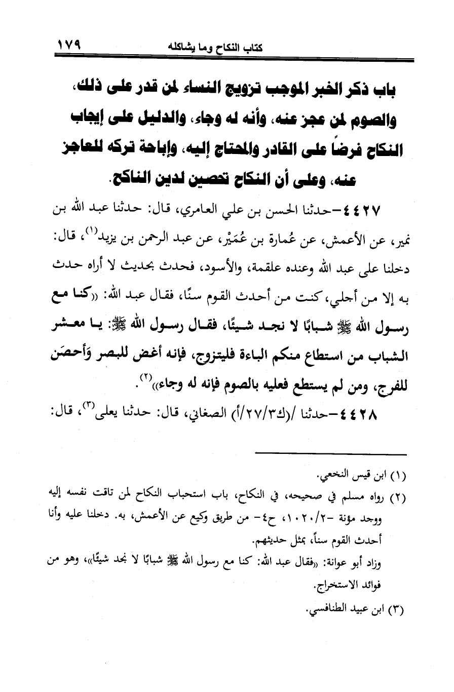 4427 - حدثنا الحسن بن علي العامري، قال: حدثنا عبد الله بن نمير، عن الأعمش، عن عُمارة بن عُمَيْر، عن عبد الرحمن بن يزيد (¬1)، قال: دخلنا على عبد الله وعنده علقمة، والأسود، فحدث بحديث لا أراه حدث به إلا من أجلي، كنت من أحدث القوم سنًّا، فقال عبد الله: "كنا مع رسول الله -صلى الله عليه وسلم- شبابًا لا نجد شيئًا، فقال رسول الله -صلى الله عليه وسلم-: يا معشر الشباب من استطاع منكم الباءة فليتزوج، فإنه أغض للبصر وَأحصَن للفرج، ومن لم يستطع فعليه بالصوم فإنه له وجاء" (¬2).
