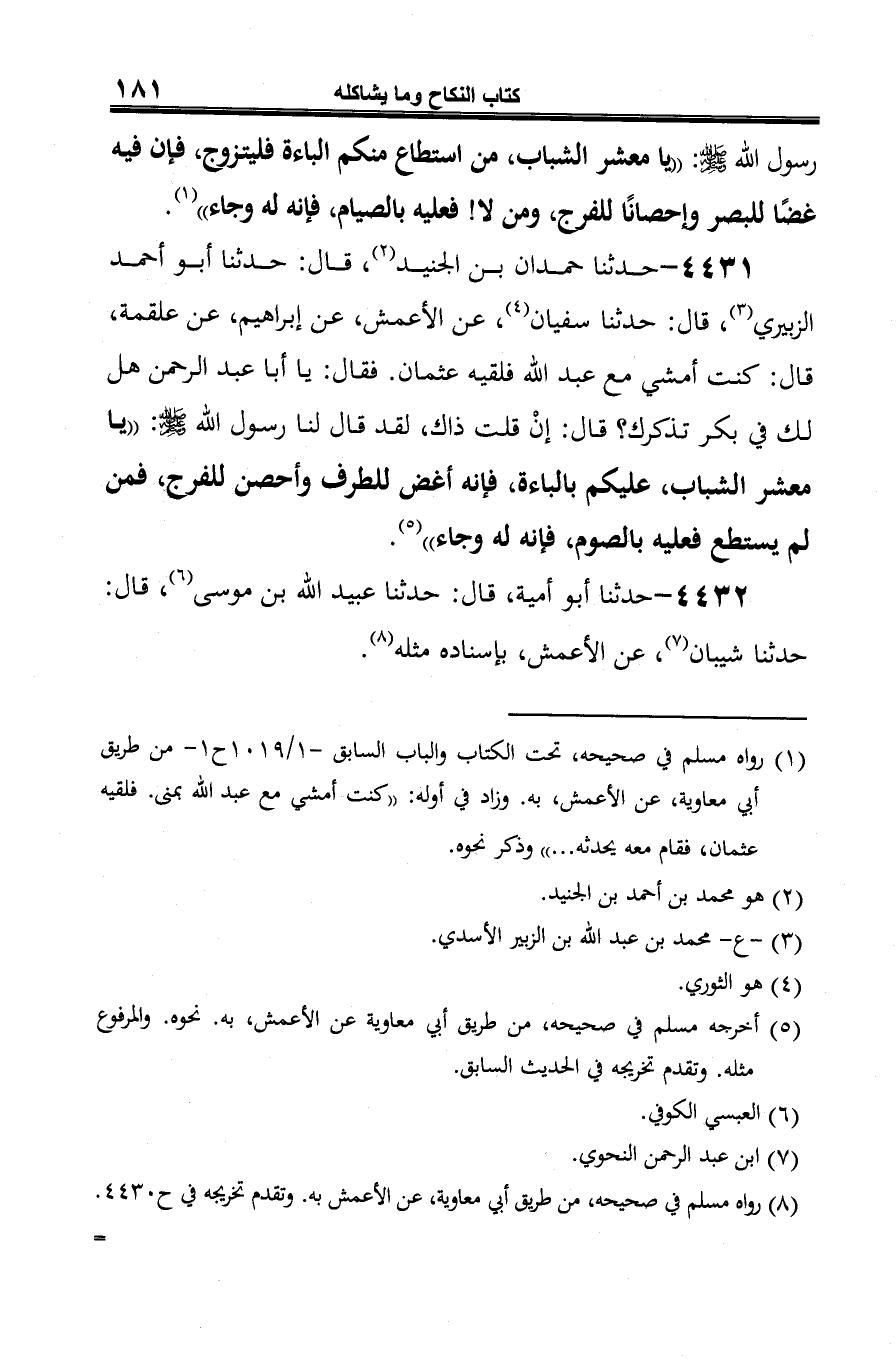 4431 - حدثنا حمدان بن الجنيد (¬1)، قال: حدثنا أبو أحمد الزبيري (¬2)، قال: حدثنا سفيان (¬3)، عن الأعمش، عن إبراهيم، عن علقمة، قال: كنت أمشي مع عبد الله فلقيه عثمان. فقال: يا أبا عبد الرحمن هل لك في بكر تذكرك؟ قال: إنْ قلت ذاك، لقد قال لنا رسول الله -صلى الله عليه وسلم-: "يا معشر الشباب، عليكم بالباءة، فإنه أغض للطرف وأحصن للفرج، فمن لم يستطع فعليه بالصوم، فإنه له وجاء" (¬4).