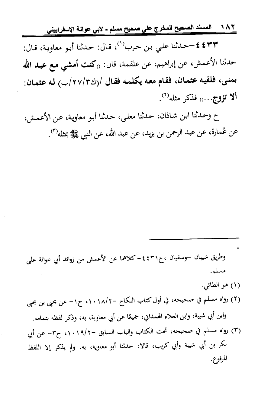(¬2) رواه مسلم في صحيحه, في أول كتاب النكاح-2/ 1018، ح 1 - عن يحيى بن يحيى وابن أبي شيبة، وابن العلاء الهمداني، جميعًا عن أبي معاوية، به، وذكر لفظه بتمامه.
