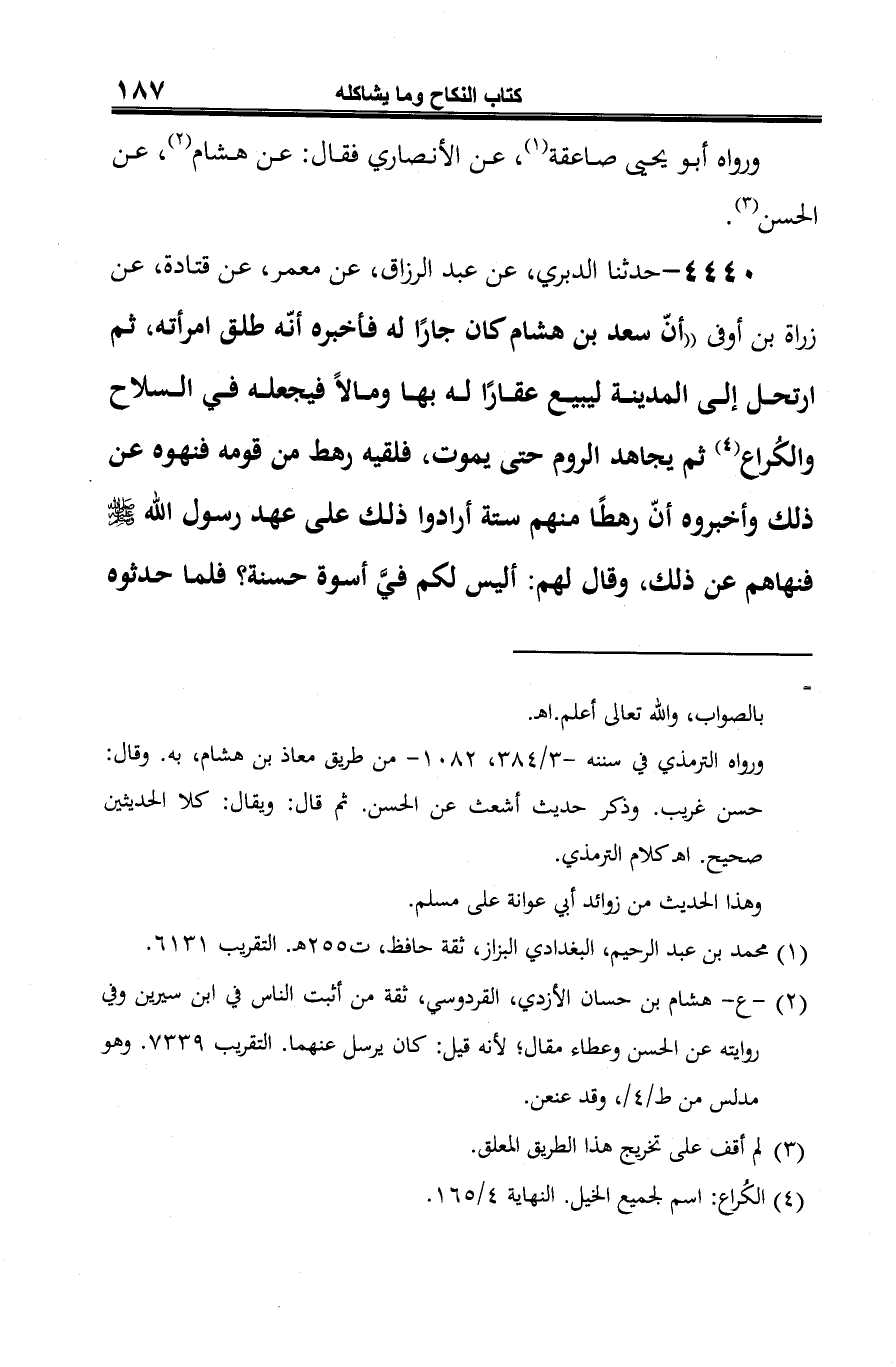 4440 - حدثنا الدبري، عن عبد الرزاق، عن معمر، عن قتادة، عن زراة بن أوفى "أنّ سعد بن هشام كان جارًا له فأخبره أنّه طلق امرأته، ثم ارتحل إلى المدينة ليبيع عقارًا له بها ومالًا فيجعله في السلاح والكُراع (¬1) ثم يجاهد الروم حتى يموت، فلقيه رهط من قومه فنهوه عن ذلك وأخبروه أنّ رهطًا منهم ستة أرادوا ذلك على عهد رسول الله -صلى الله عليه وسلم- فنهاهم عن ذلك، وقال لهم: أليس لكم فيَّ أسوة حسنة؟ فلما حدثوه