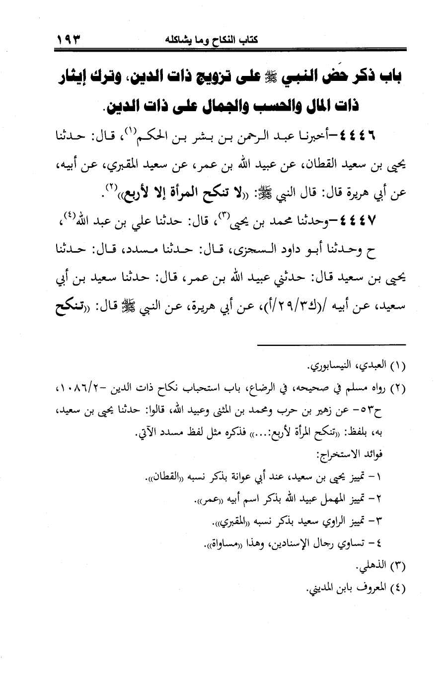 4446 - أخبرنا عبد الرحمن بن بشر بن الحكم (¬1)، قال: حدثنا يحيى بن سعيد القطان، عن عبيد الله بن عمر، عن سعيد المقبري، عن أبيه، عن أبي هريرة قال: قال النبي -صلى الله عليه وسلم-: "لا تنكح المرأة إلا لأربع" (¬2).