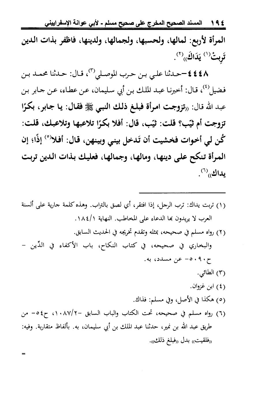 4448 - حدثنا علي بن حرب الموصلي (¬1)، قال: حدثنا محمَّد بن فضيل (¬2)، قال: أخبرنا عبد الملك بن أبي سليمان، عن عطاء، عن جابر بن عبد الله قال: "تزوجت امرأة فبلغ ذلك النبي -صلى الله عليه وسلم- فقال: يا جابر، بكرًا تزوجت أم ثيّب؟ قلت: ثيّب، قال: أفلا بكرًا تلاعبها وتلاعبك، قلت: كُن لي أخوات فخشيت أن تَدخل بيني وبينهن، قال: أفلا (¬3) إذًا؛ إن المرأة تنكح على دينها، ومالها، وجمالها، فعليك بذات الدين تربت يداك" (¬4).