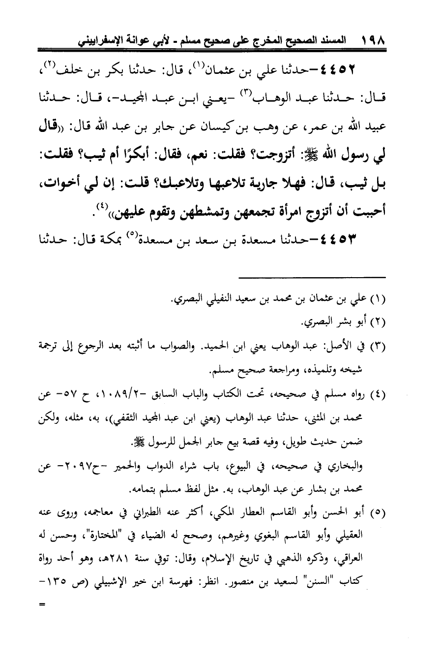 4452 - حدثنا علي بن عثمان (¬1)، قال: حدثنا بكر بن خلف (¬2)، قال: حدثنا عبد الوهاب (¬3) -يعني ابن عبد المجيد-، قال: حدثنا عبيد الله بن عمر، عن وهب بن كيسان عن جابر بن عبد الله قال: "قال لي رسول الله -صلى الله عليه وسلم-: أتزوجت؟ فقلت: نعم، فقال: أبكرًا أم ثيب؟ فقلت: بل ثيب، قال: فهلا جارية تلاعبها وتلاعبك؟ قلت: إن لي أخوات، أحببت أن أتزوج امرأة تجمعهن وتمشطهن وتقوم عليهن" (¬4).