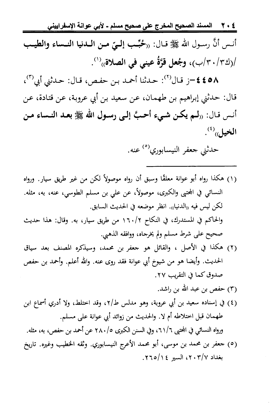 4458 - ز قال (¬1): حدثنا أحمد بن حفص، قال: حدثني أبي (¬2)، قال: حدثني إبراهيم بن طهمان، عن سعيد بن أبي عروبة، عن قتادة، عن أنس قال: "لم يكن شيء أحبَّ إلى رسول الله -صلى الله عليه وسلم- بعد النساء من الخيل" (¬3).